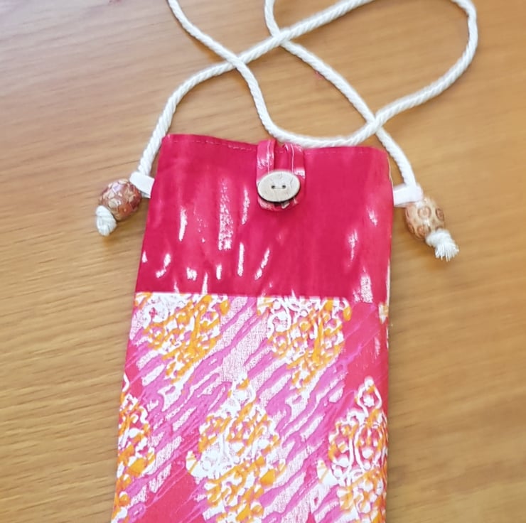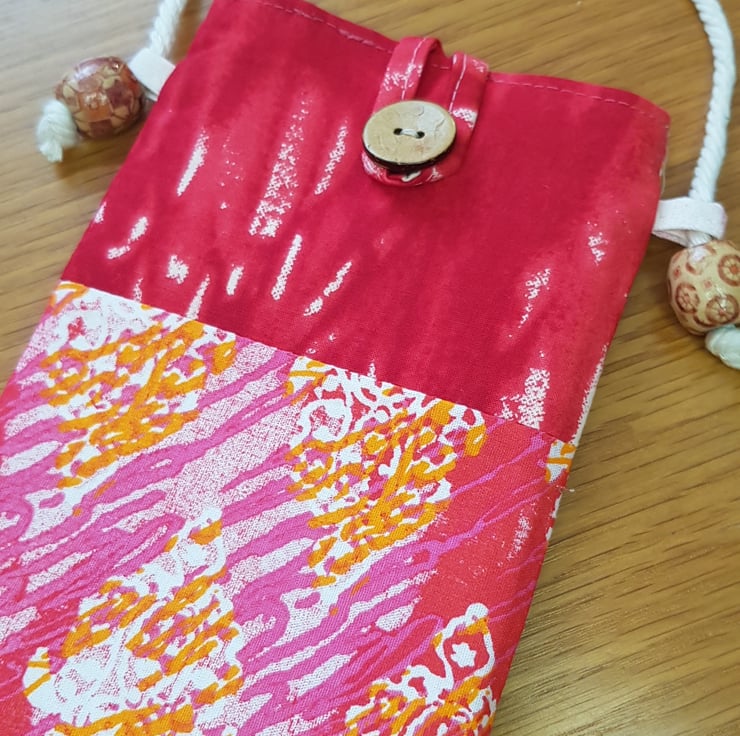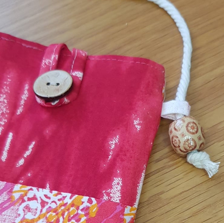This mobile phone pouch is made from coordinating Indian block print cotton fabrics. It is lined with calico and interfaced with wadding to provide cushioning. The strap is cotton twisted rope and secured with African wooden beads through loops on the side.