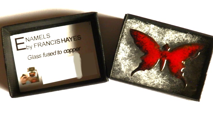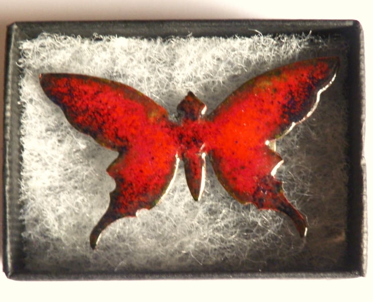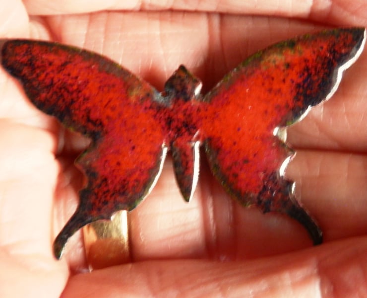 After building up several layers of clear enamel on the copper shape, I have added a layer of red. Red enamel will readily burn to black and in this case it has generated a subtle blue-black derkening of the edges of the wings.