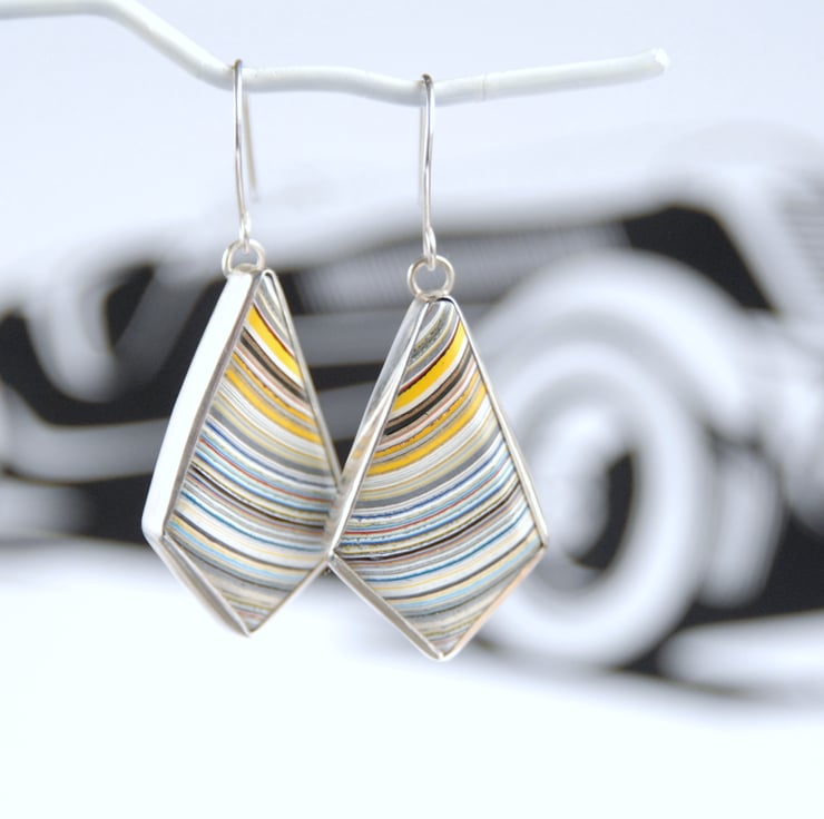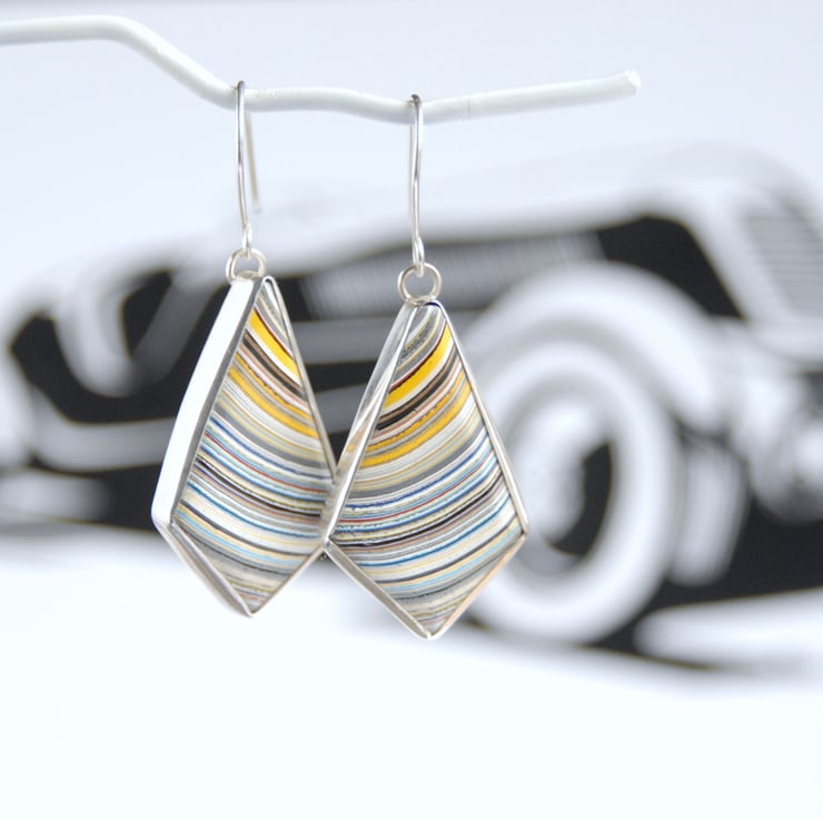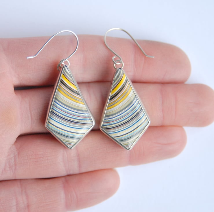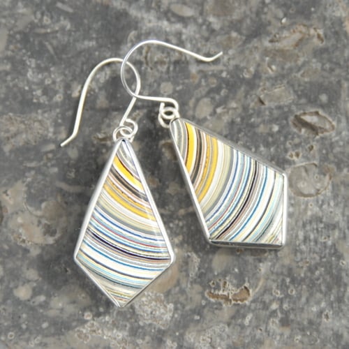 These drop earrings feature kite shaped pieces of fordite bezel set in sterling silver and finished off with sterling silver hooks. The fordite has fine curving stripes of colour arcing across it in shades of yellow, grey, beige, white and blue fading from yellow at the top to the blues at the bottom. The kites are a mirror matched pair so the bands arc in opposite directions (I was very pleased with myself when I managed that as I cut the fordite myself and it's rare to get such a well matched pair). Measure 48mm by 19mm including the hooks. Comes gift boxed.