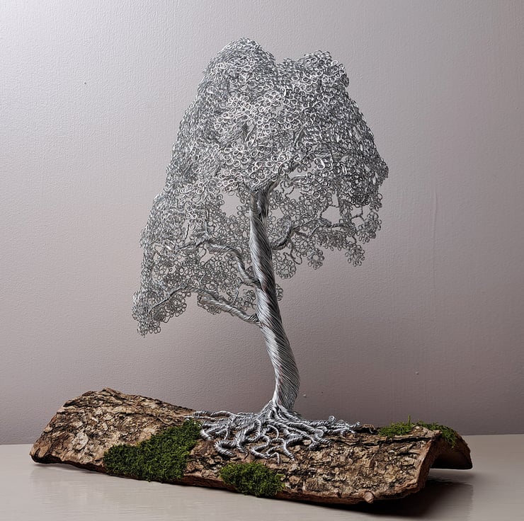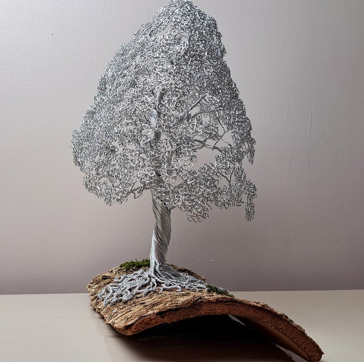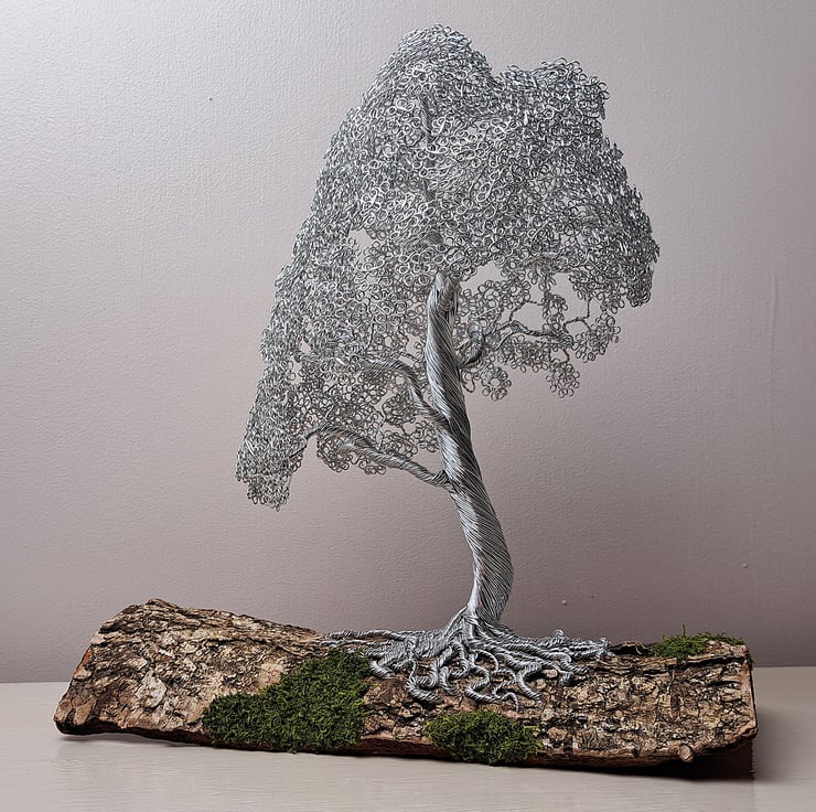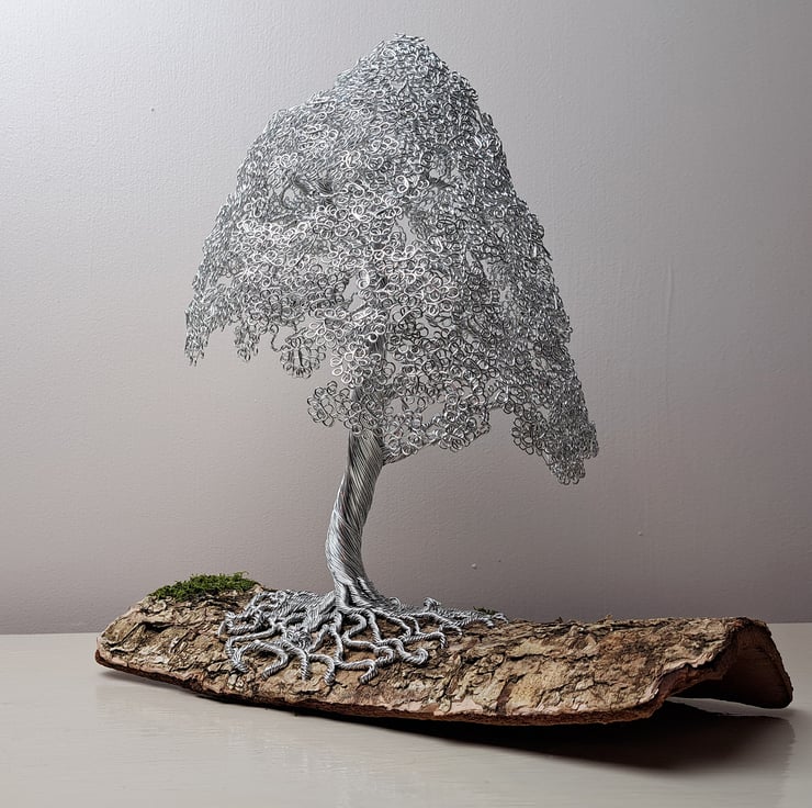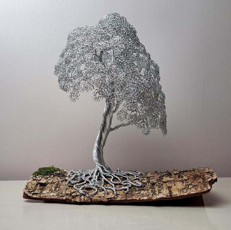 Beautiful mini wire Oak tree mounted on Elm bark. This is a beautiful and elegant tree. The Nebari (surface root system) spirals from the Elm bark base with grass detail up the trunk to the delicate branch structure leading to the foliage. The tree has the appearance of a mature Oak that can be seen in most Uk parks up and down the country.