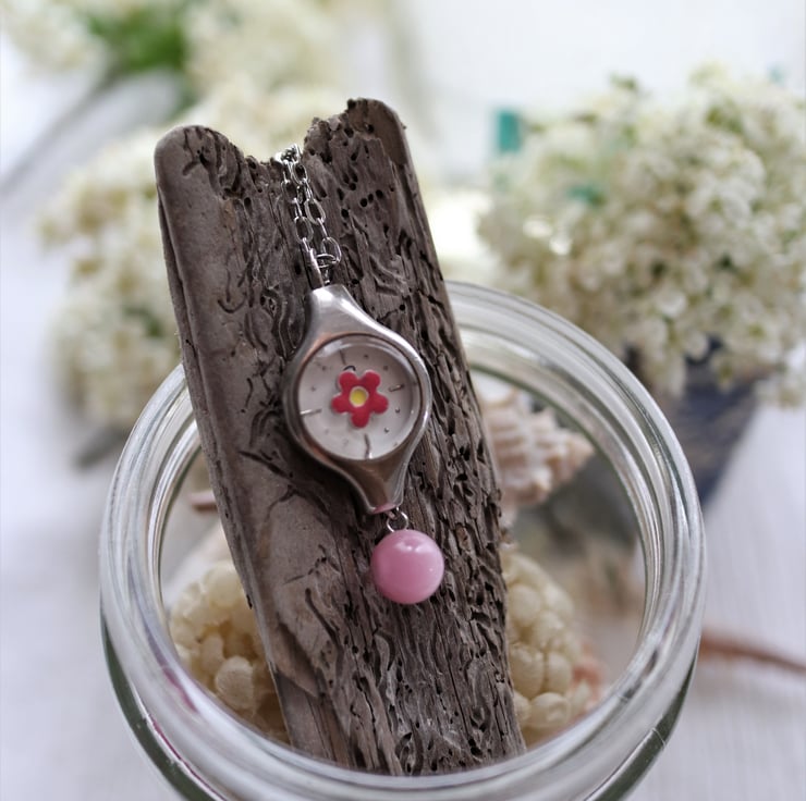Upcycled ladies watch decorated with flower bead and cat eye bead handmade necklace - one off item - gift for her