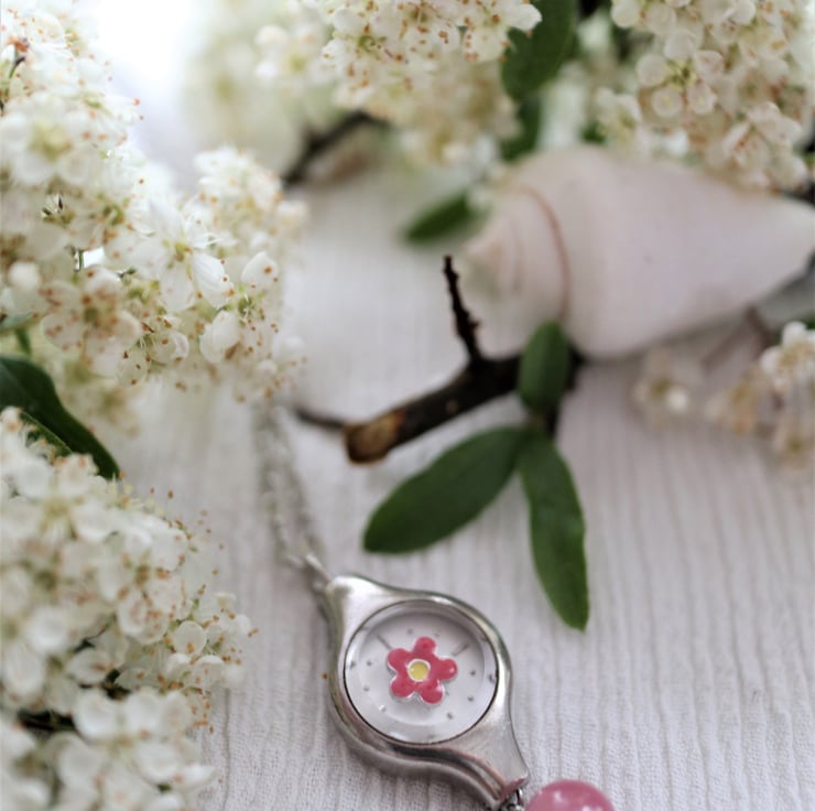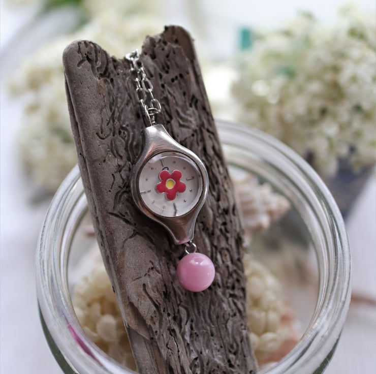 Upcycled ladies watch decorated with flower bead and cat eye bead handmade necklace - one off item - gift for her