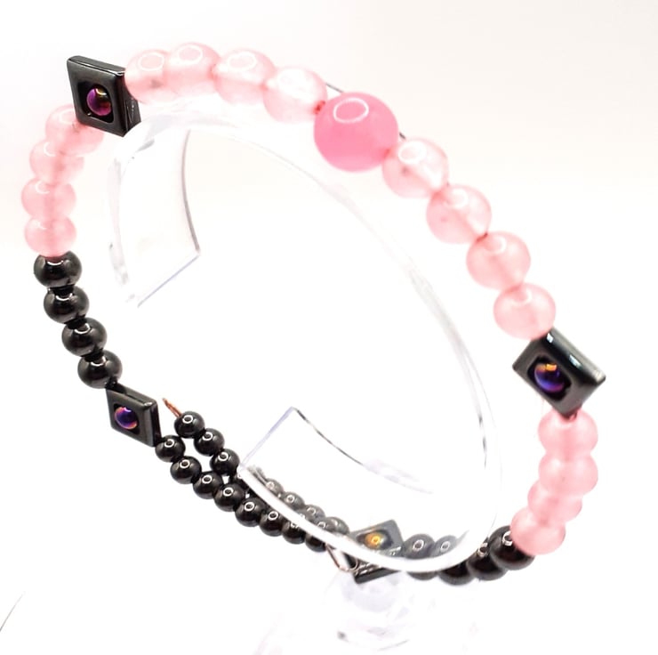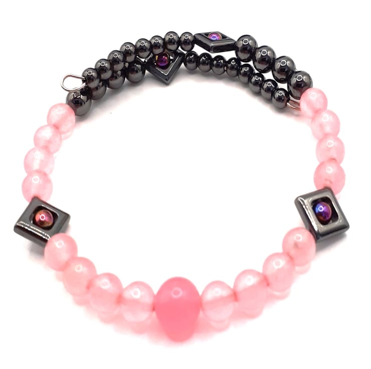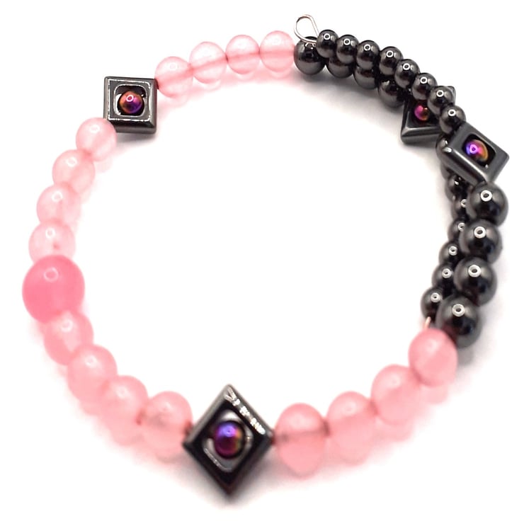 Magnetic hematite beads and non magnetic beads with sleek black squares with Pink Jade beads. Magnetic Hematite Aurora Borealis Beads combine the natural allure of hematite with an iridescent shimmer. Sleek black hematite squares exude a modern elegance. Delicate and feminine, pink jade beads infuse your bracelet with a soft, calming energy perfect for adding a touch of serenity.