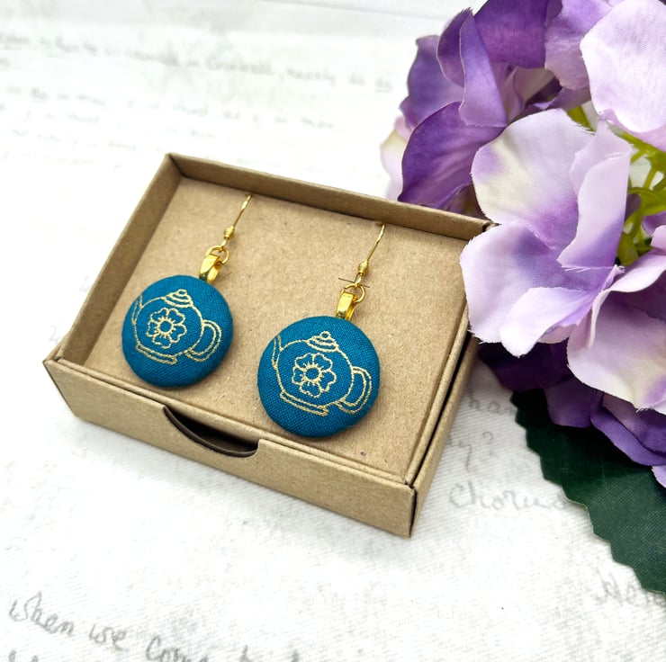 These pretty Japanese teapot fabric button earrings will come to you safe and carefully packaged in a UK Made eco-friendly recycled kraft card jewellery box with brand logo on the top - perfect for gifting to a friend who loves to drink tea, is a fan of Japanese tea ceremonies, or to keep as a gift for yourself!
