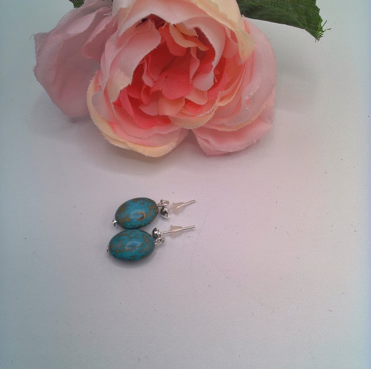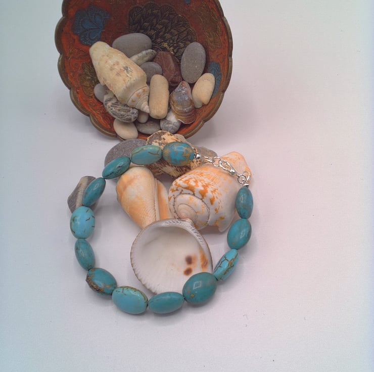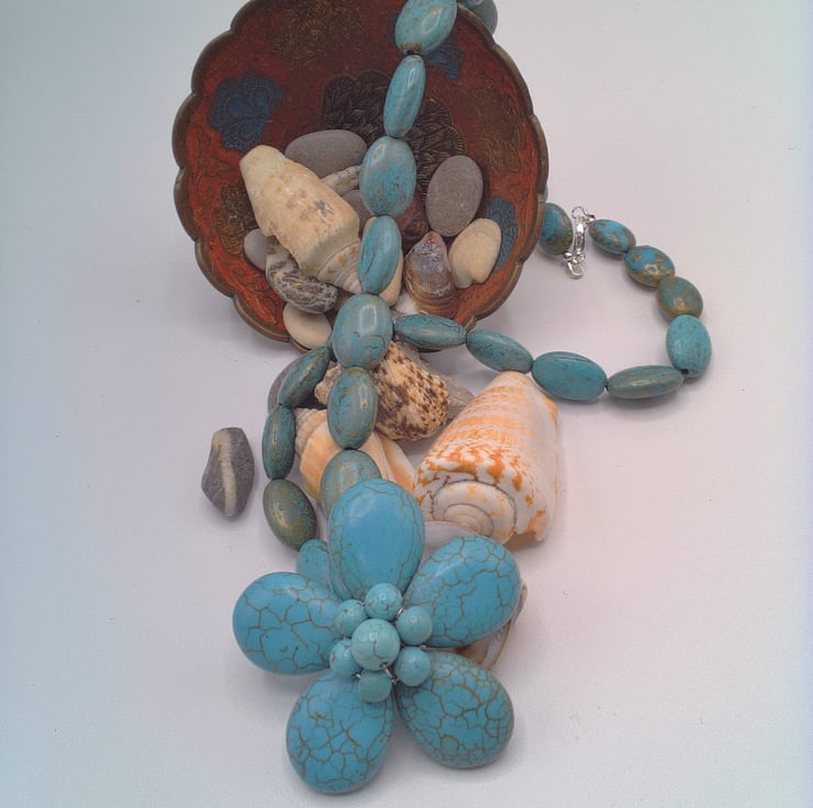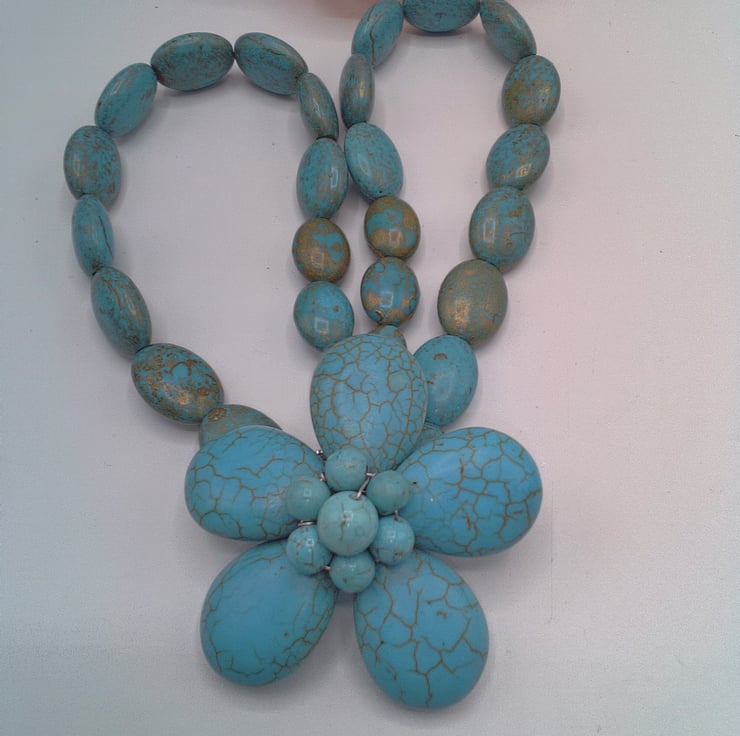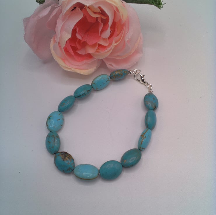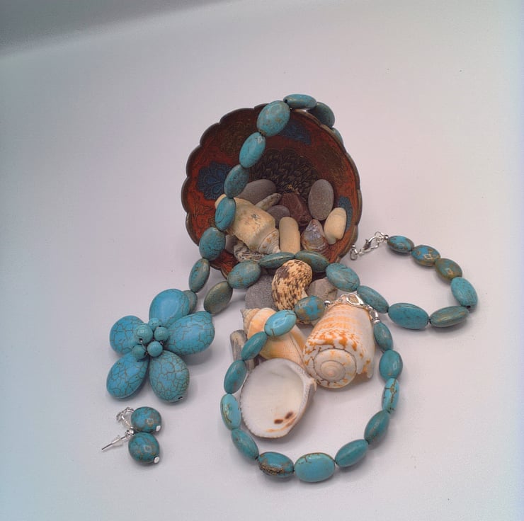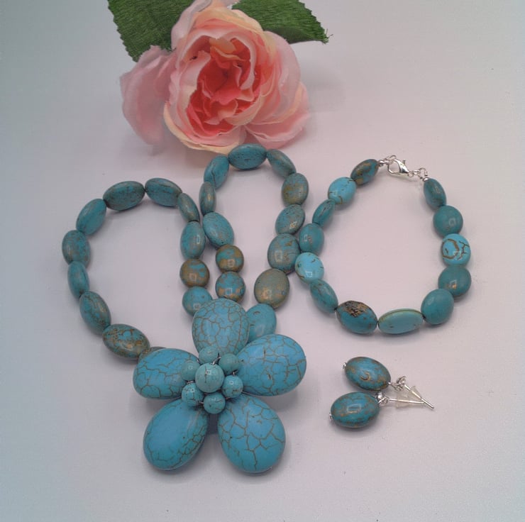 This lovely turquoise howlite necklace with a wire wrapped flower centre, bracelet and earrings.The set would make a lovely gift for someone special. The necklace is made using 18 mm x 12 mm, and 15 mm x 8 mm, turquoise dyed howlite oval beads, with a wire wrapped turquoise flower centrepiece. The bracelet and earrings are made using the same smaller oval beads. The necklace and bracelet are secured with a silver plated lobster clasp and the earrings have silver plated studs. The necklace is 20 inches (51 cm) in length, the bracelet is 8.5 inches (21.5 cm) long and the earrings have a drop of 0.75 inches (2 cm) from the base of the studs. The jewellery set will be dispatched wrapped in tissue paper in an organza bag and delivered via Royal Mail first class post. The set would look great for everyday wear or an evening out.