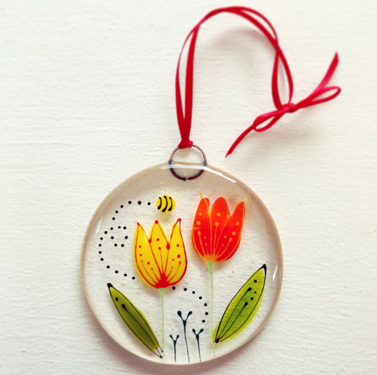 The bold beautiful colours of the yellow and orange tulips decorate this joyful spring suncatcher....It also has my signature little bee buzzing about!