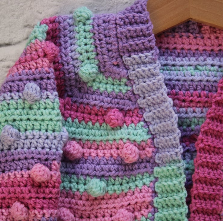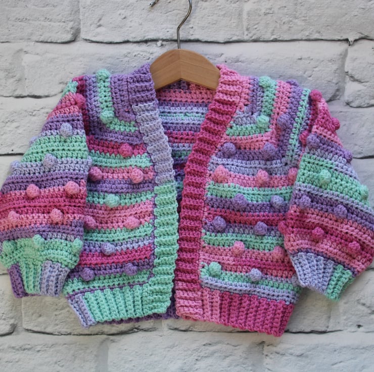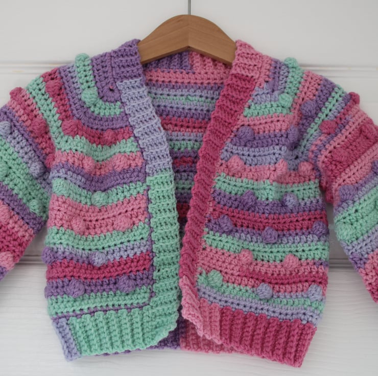A super cute and colourful bobble cardigan for a baby girl aged 6-12 Months.