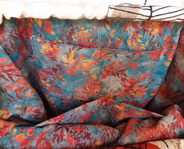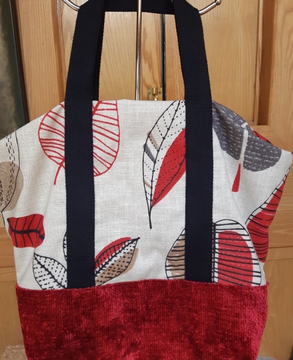 Roomy and practical 'Mary Poppins' bag on a sprung frame, featuring a luxurious red velour base and a vintage linen leaf print. Lined in a toning batik cotton print, with inner pockets and cotton webbing handles.