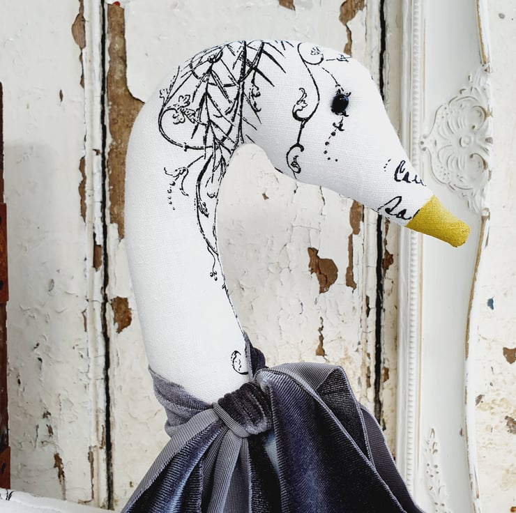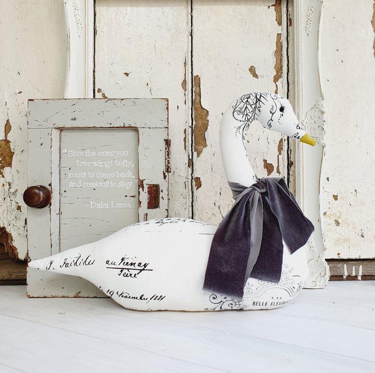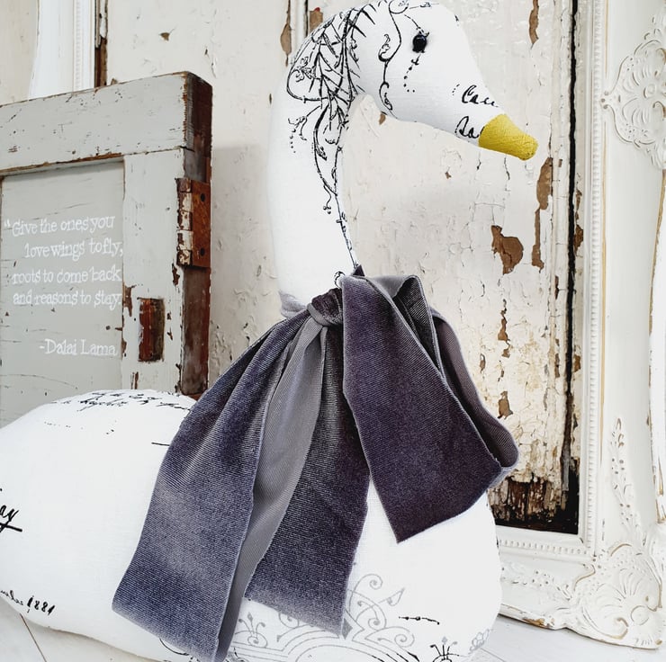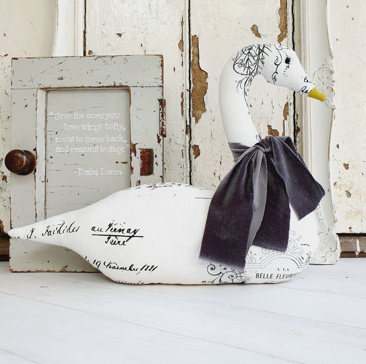 This is a lovely large Snow Goose made out of beautiful thick French script linen. She has a handmade grey velvet ribbon tied around her neck and hand painted beak. Her eyes are small beads so she is for decorative purposes only. She has been slightly weighted so she is able to stand alone. She will look beautiful in your home all year round.