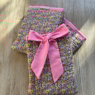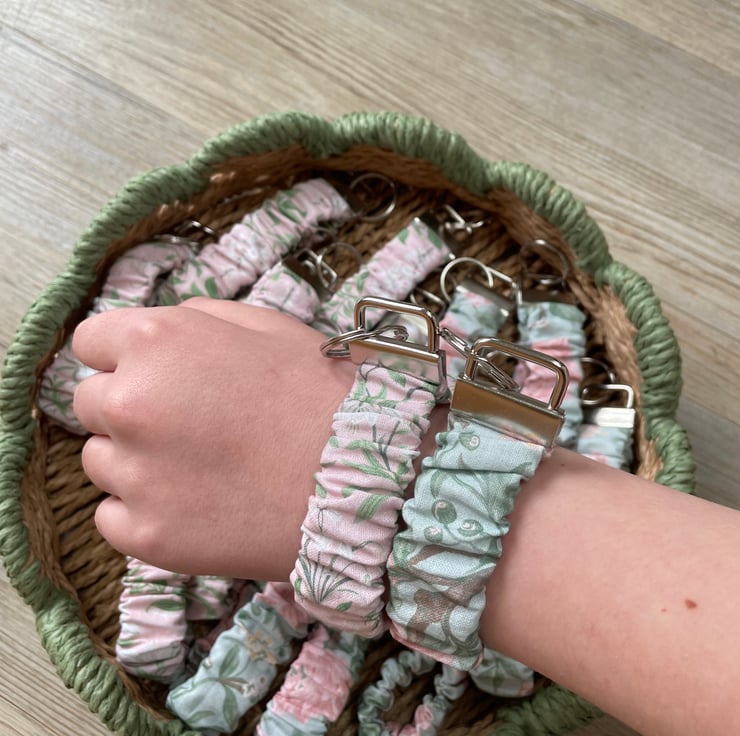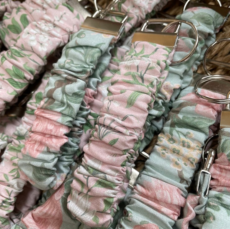 Spring floral wrist keychains, perfect for when you have your hands full, no need to dig around in your handbag just pop this scrunchie type keychain around your wrist. Pink and blue floral design with silver hardware. This keychain makes a perfect gift.