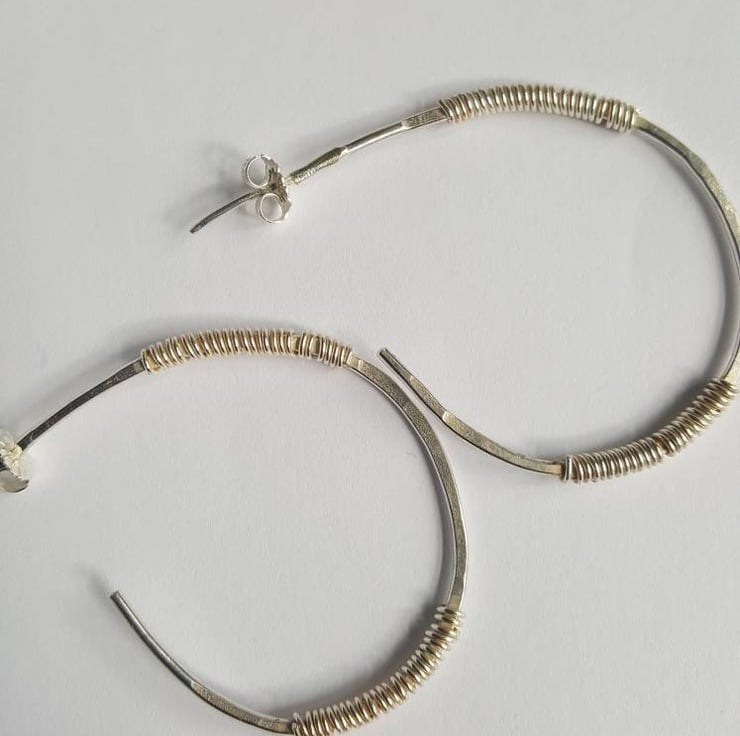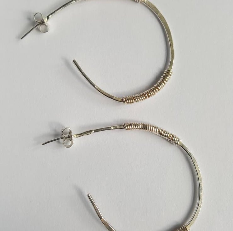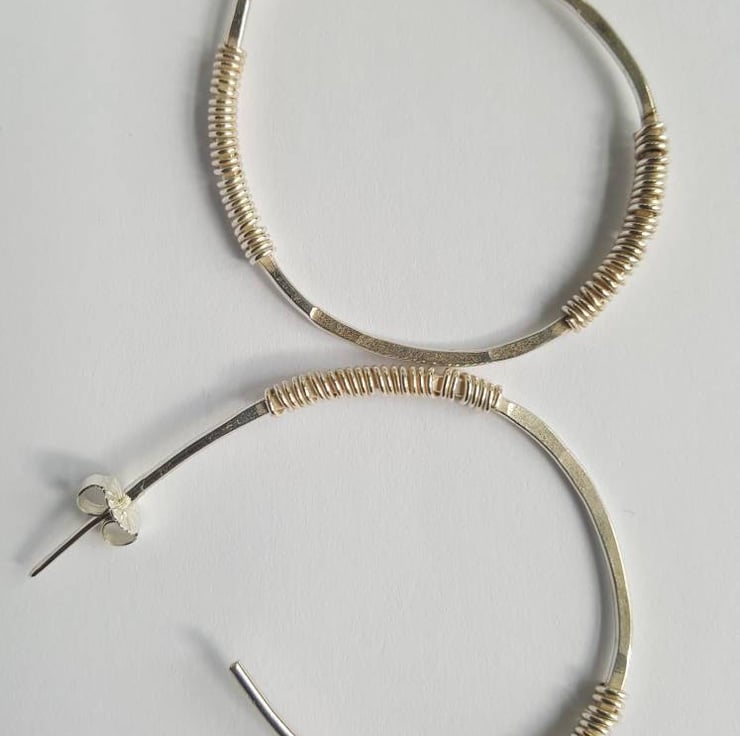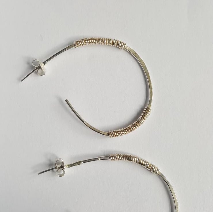 Featuring two sections of fine silver wire wrapping, these hoops showcase a refined, artisanal touch. They are lightweight and secure comfortably with sterling silver butterfly backs, making them perfect for all-day wear.