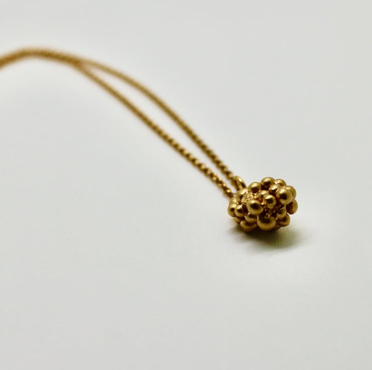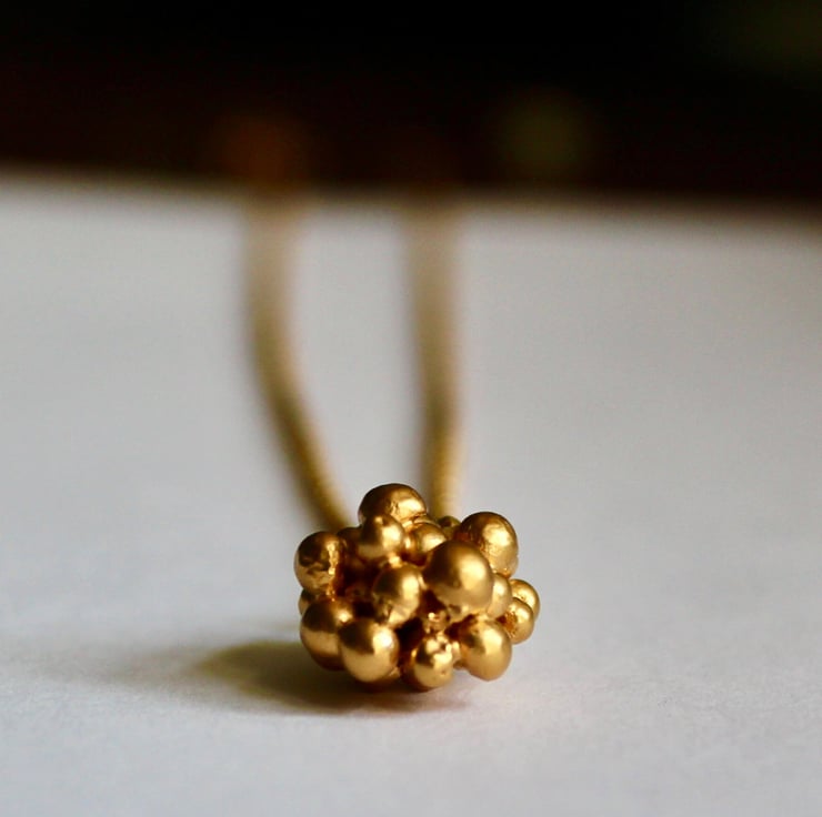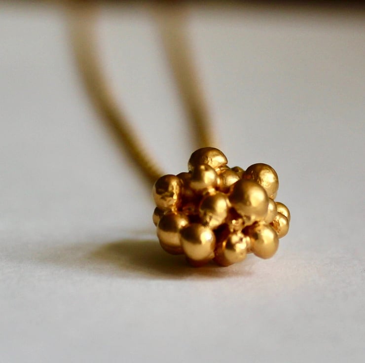 This cute granulation necklace has been made in silver and then been plated in 22 carat yellow gold. Each ball has been individually made from recycled silver and then soldered together to create the irregular ball shape