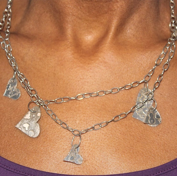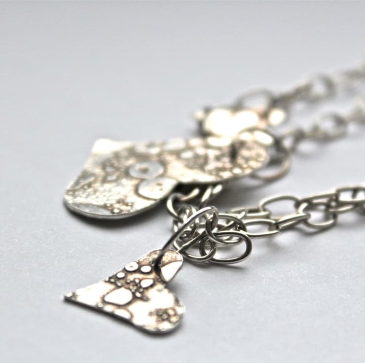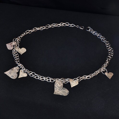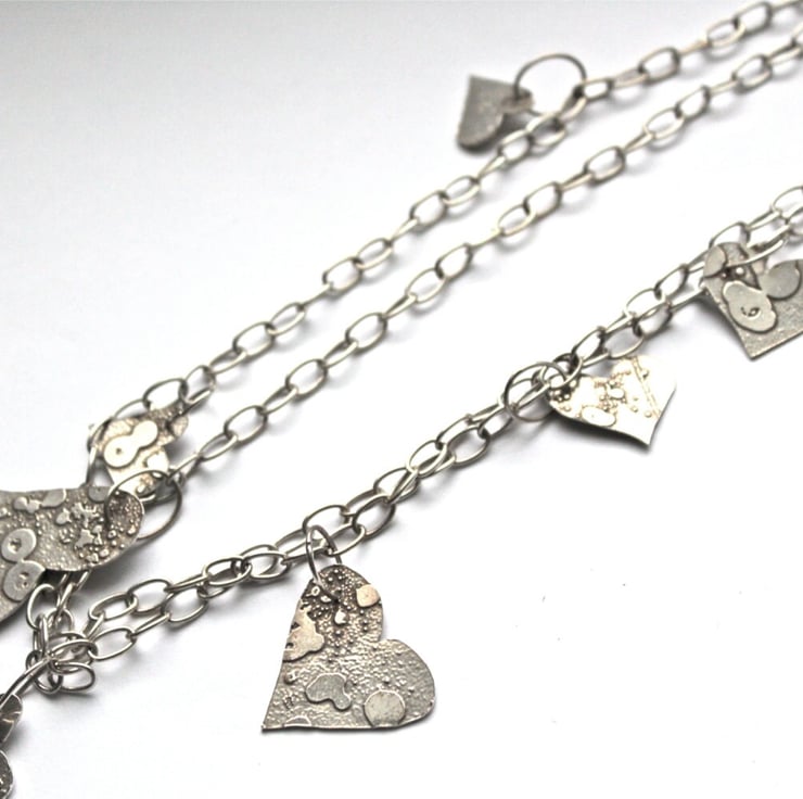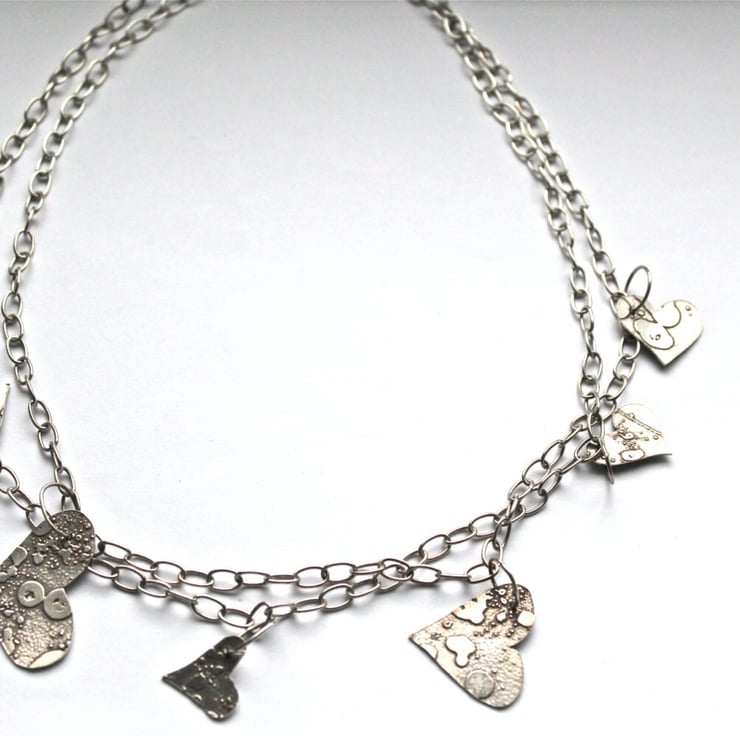 Seven textured silver hearts of different sizes, the smallest being almost 1.5 cms across to the largest being 3.3 cm at its widest point and 1 cm in length, and hang off two strands of silver chain with oval links.