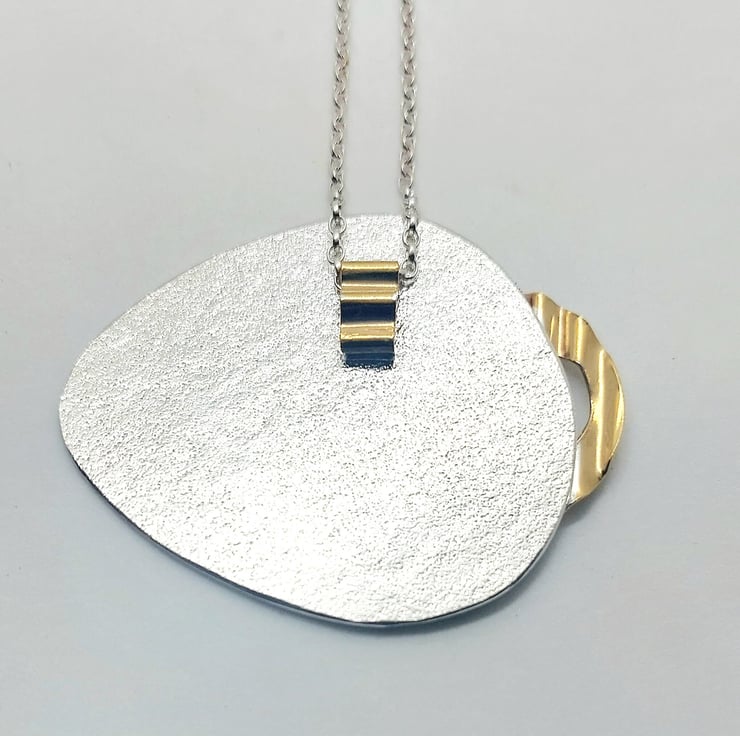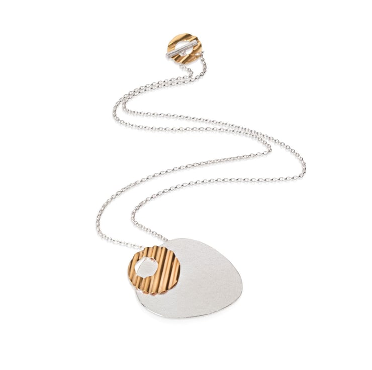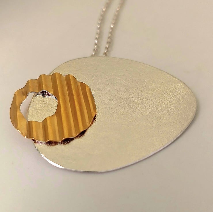 This beautiful recycled silver and gold plated necklace certainly makes a statement! The pendant has a textured polished silver egg shape. A 22 carat, yellow gold plated circular crinkle textured form, with a smaller circle cut from it, has been added. On the reverse there is more gold plating, as well as on the fastening.