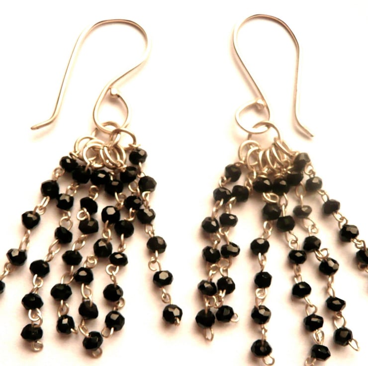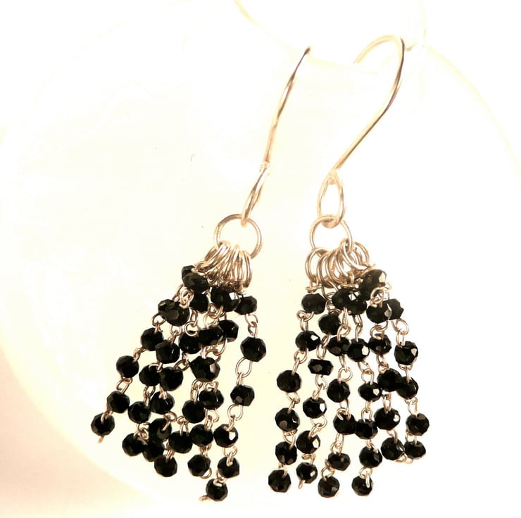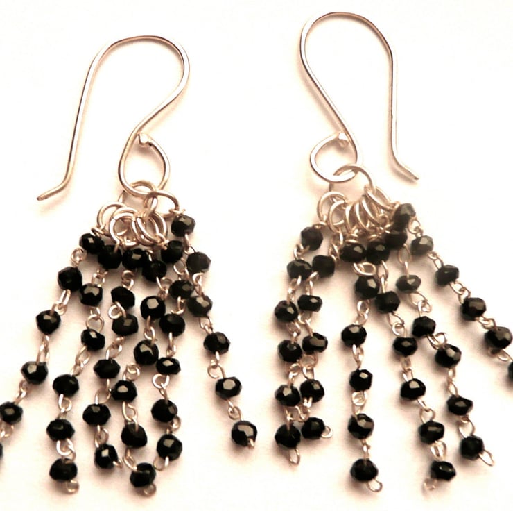These handmade black spinel drop earrings are perfect for adding a touch of glamour to any outfit. Featuring six strands of sparkling faceted black spinel gemstones, these earrings offer beautiful movement and catch the light effortlessly.