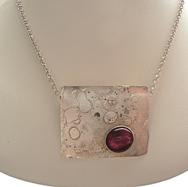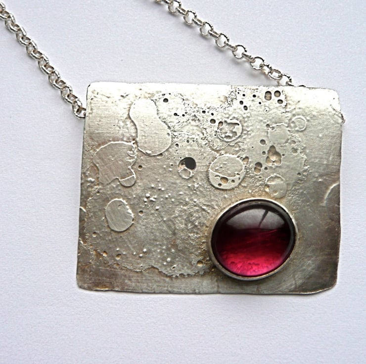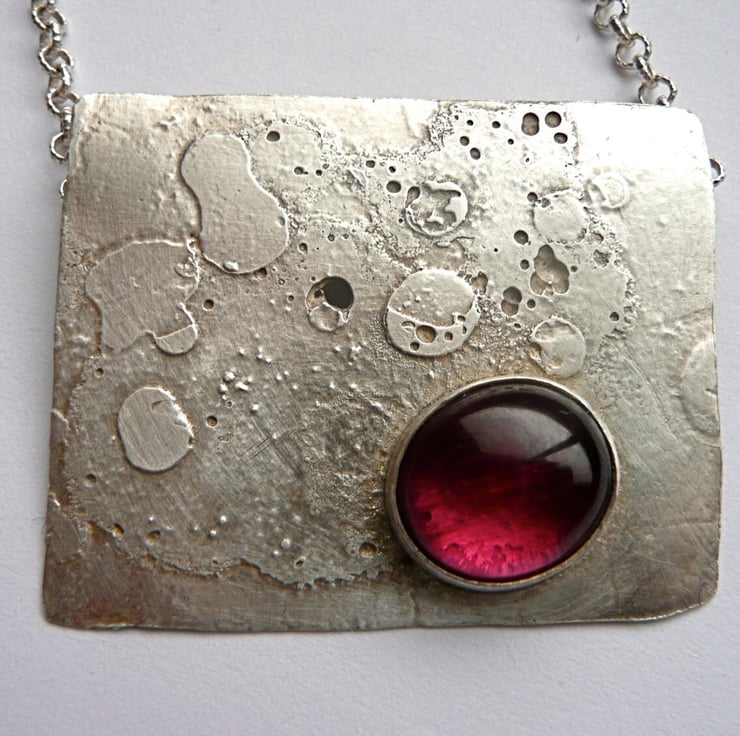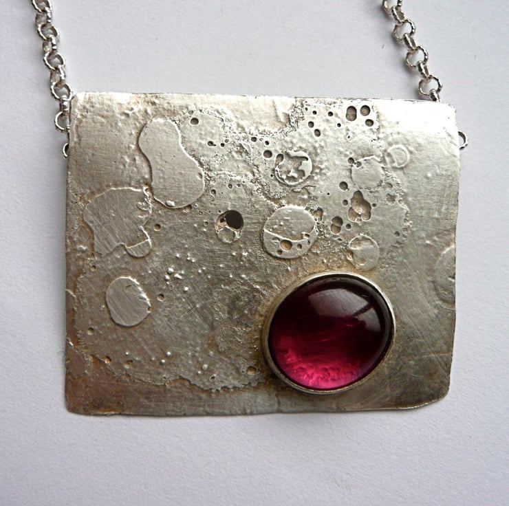 This unique silver necklace features a stunning hot pink tourmaline gemstone set on an etched silver pendant. This handmade necklace draws inspiration from ancient, primitive designs, giving it a timeless and artisanal feel.
