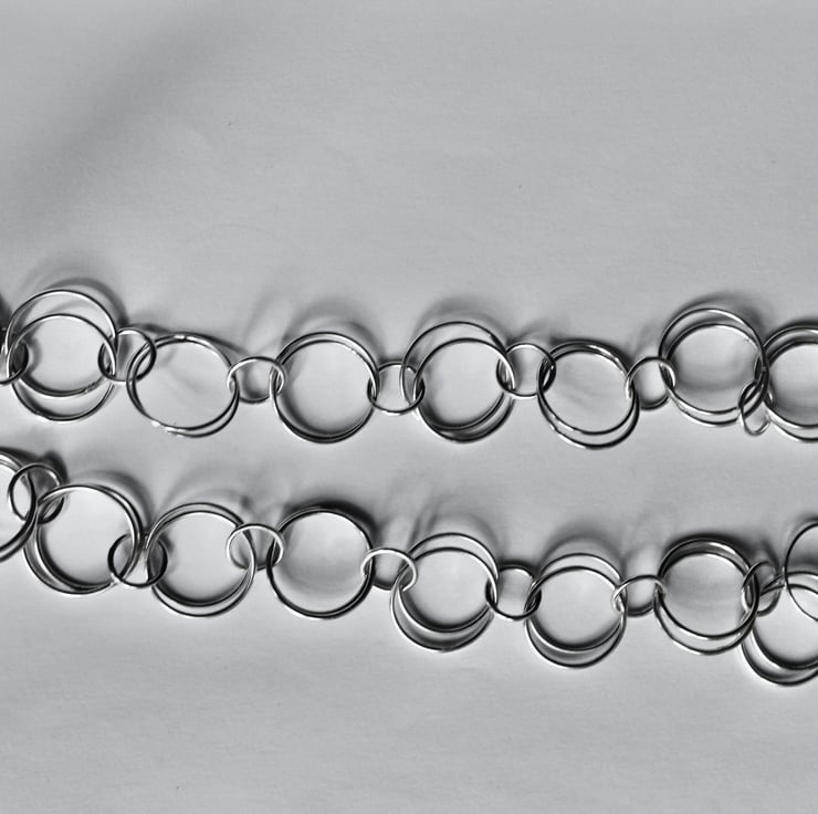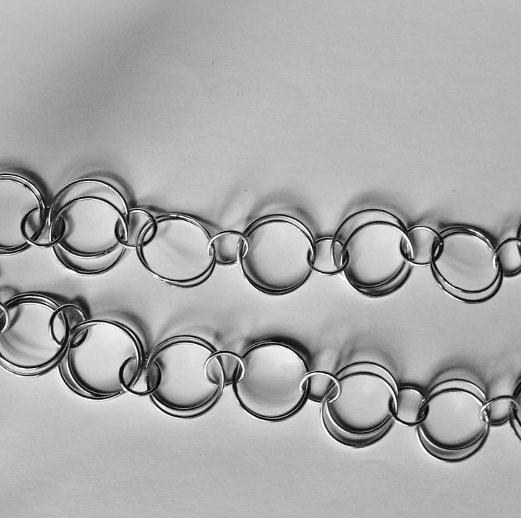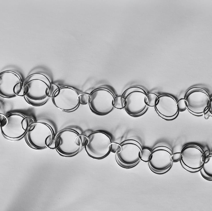 Elevate your jewellery collection with this handmade recycled silver necklace, meticulously crafted from 42 interlocking circular links. Each link is doubled and joined with smaller silver hoops, creating a delicate yet durable design that is both stylish and versatile.