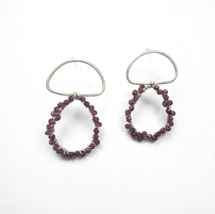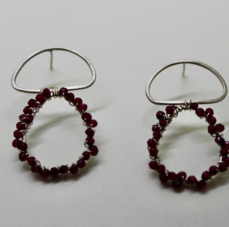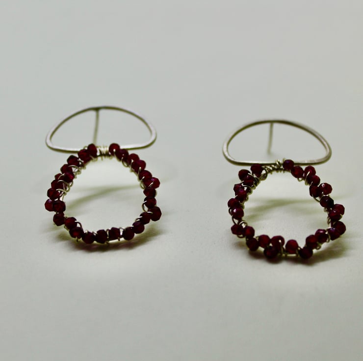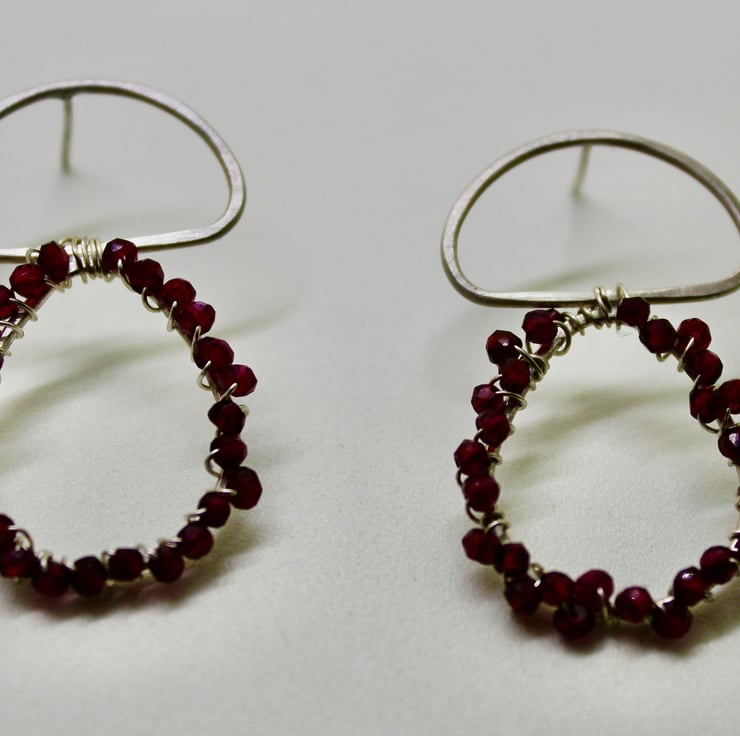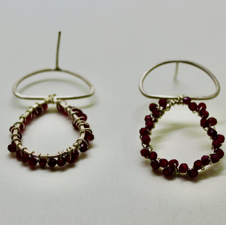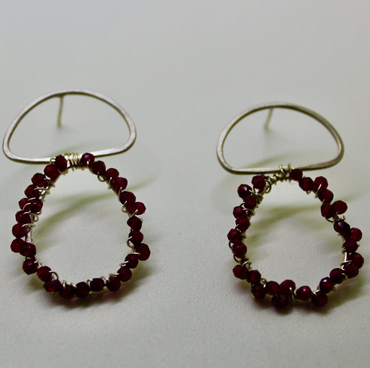 The garnets add a sparkle to these geometric earrings. Made with a recycled silver wire, each garnet bead has been attached with silver wire