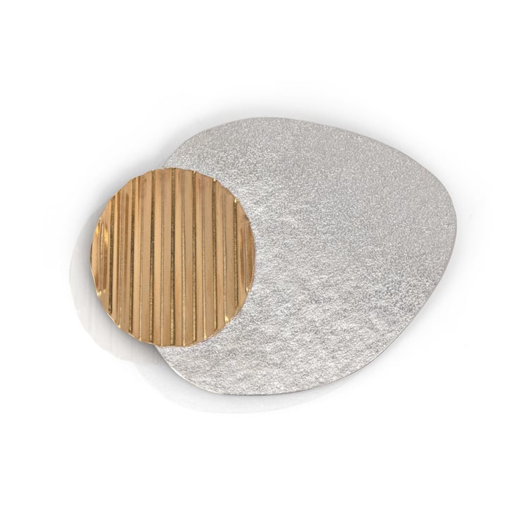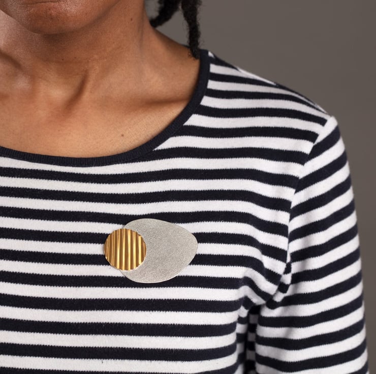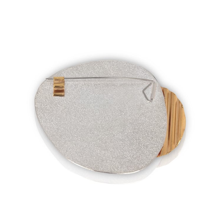Treat yourself or your loved one to this beautiful brooch, handmade with a textured recycled silver and gold plated silver! I find this pebble/egg shape really pleasing and feel that with the addition of the "corrugated"circle added to the brooch it appeals to my love of the modernist style - hopefully you'll feel the same.