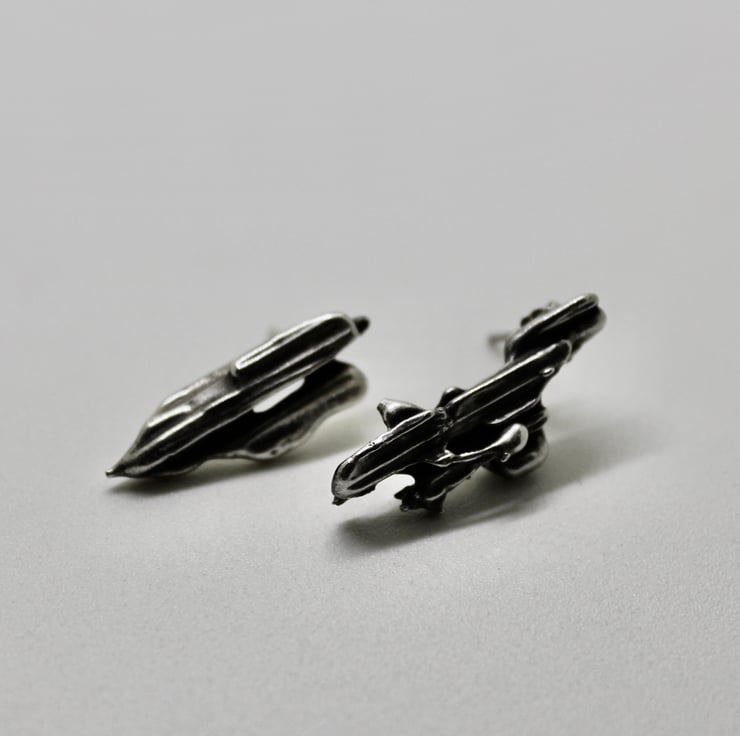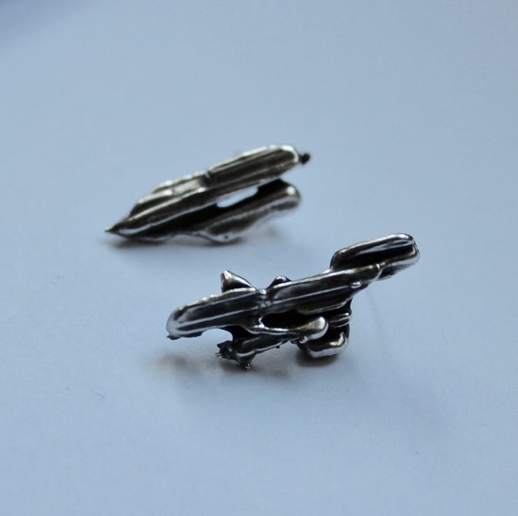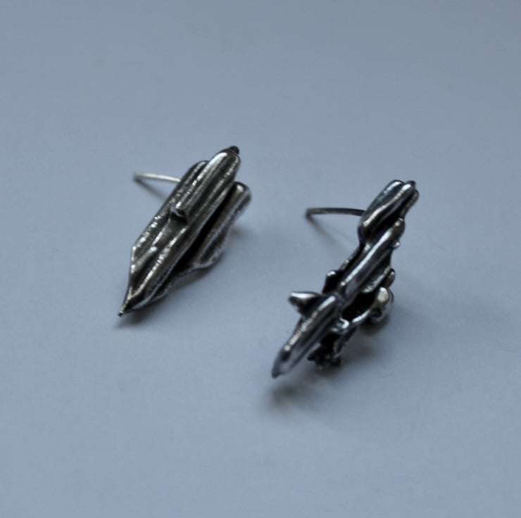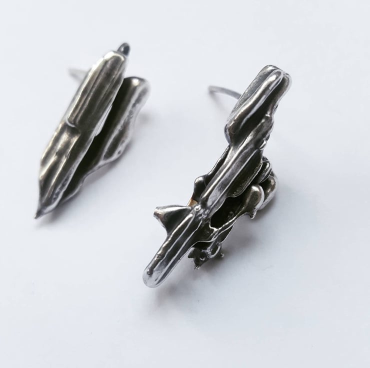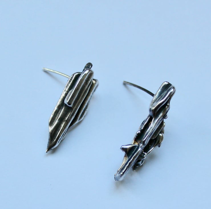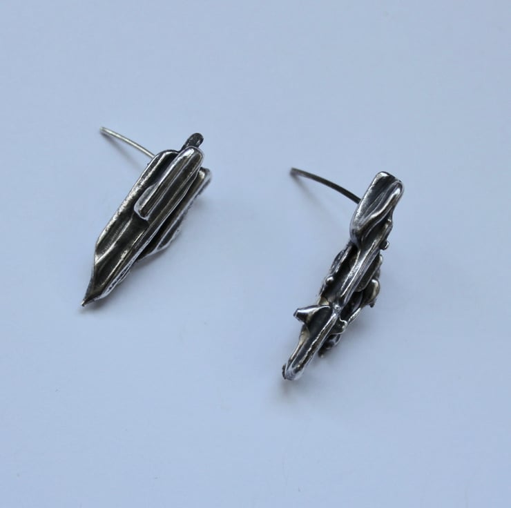 I really like mismatched earrings, they can be worn as a pair or mix them up with other earrings that are in your collection. I have made these by melting recycled silver and pouring the metal over the spikes of a broom, forming these abstract shapes. The silver has then been blackened and have a grey/black tone to them.