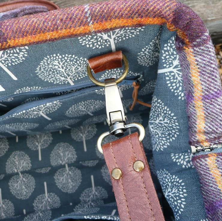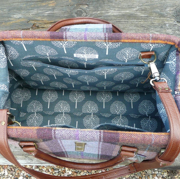 This is a classic style carpet bag made from Art of the Loom British wool tweed and finished off with handcrafted rich brown leather handles and shoulder strap.