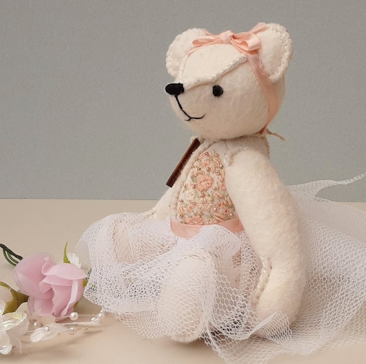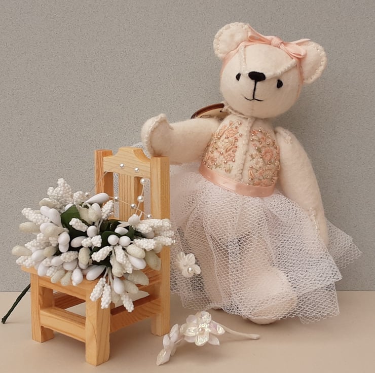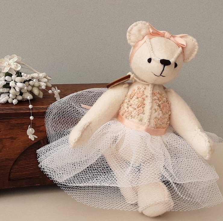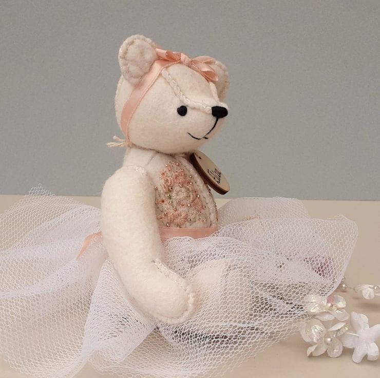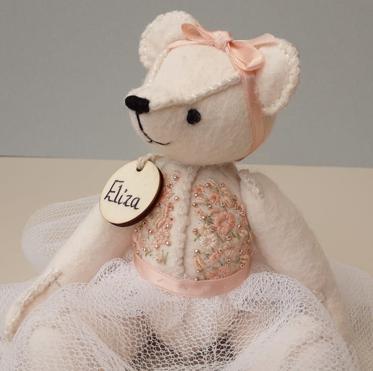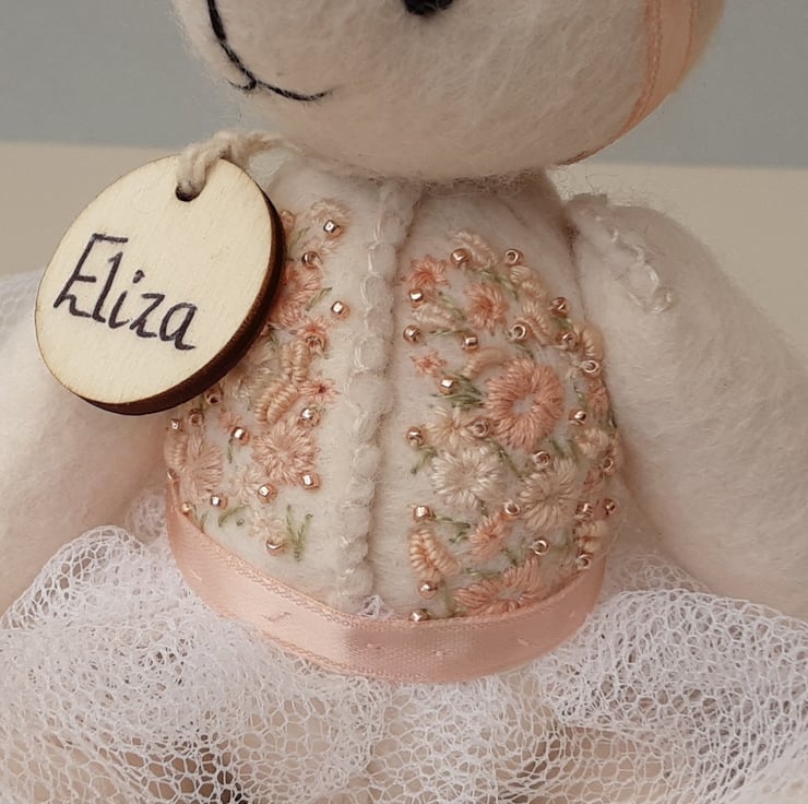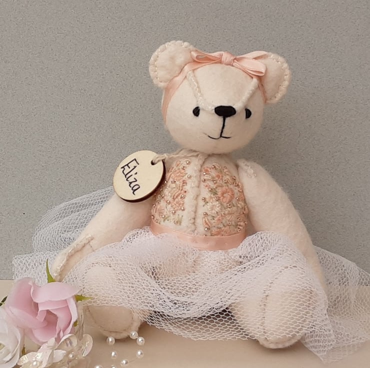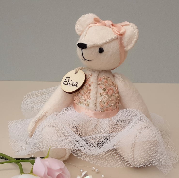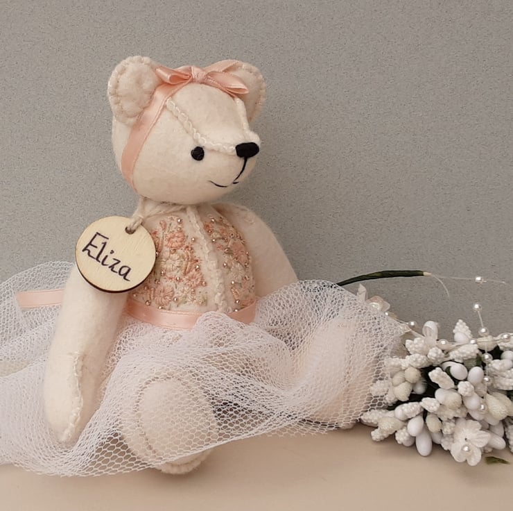 Eliza has been designed as a little ballerina bear, she wears a pretty tutu in off white in a fine soft netting with a narrow satin ribbon in peach to the waist.