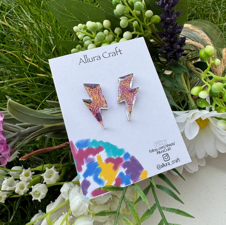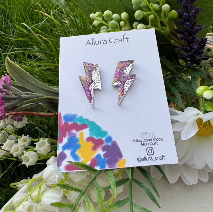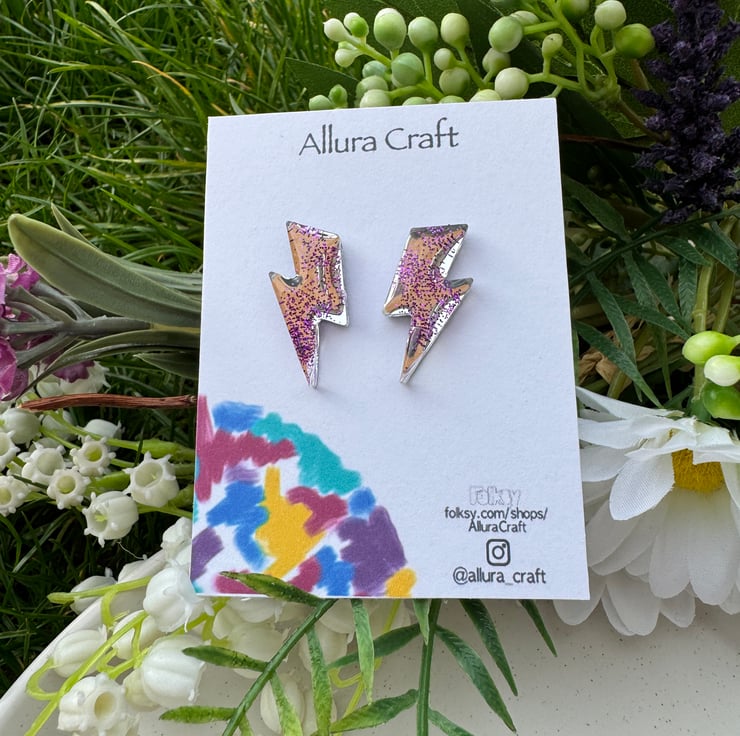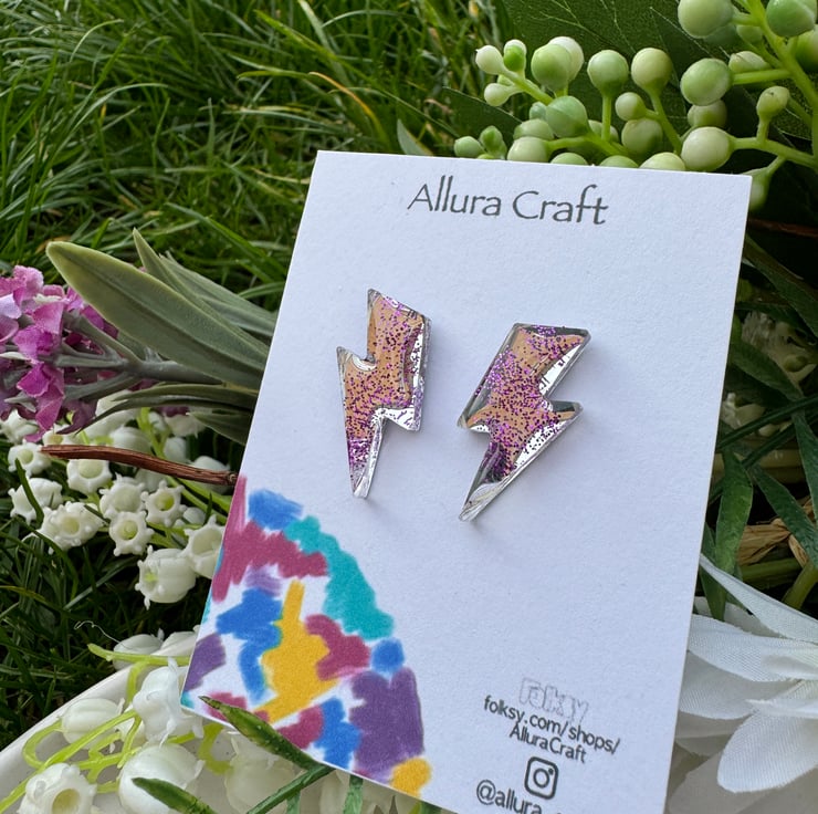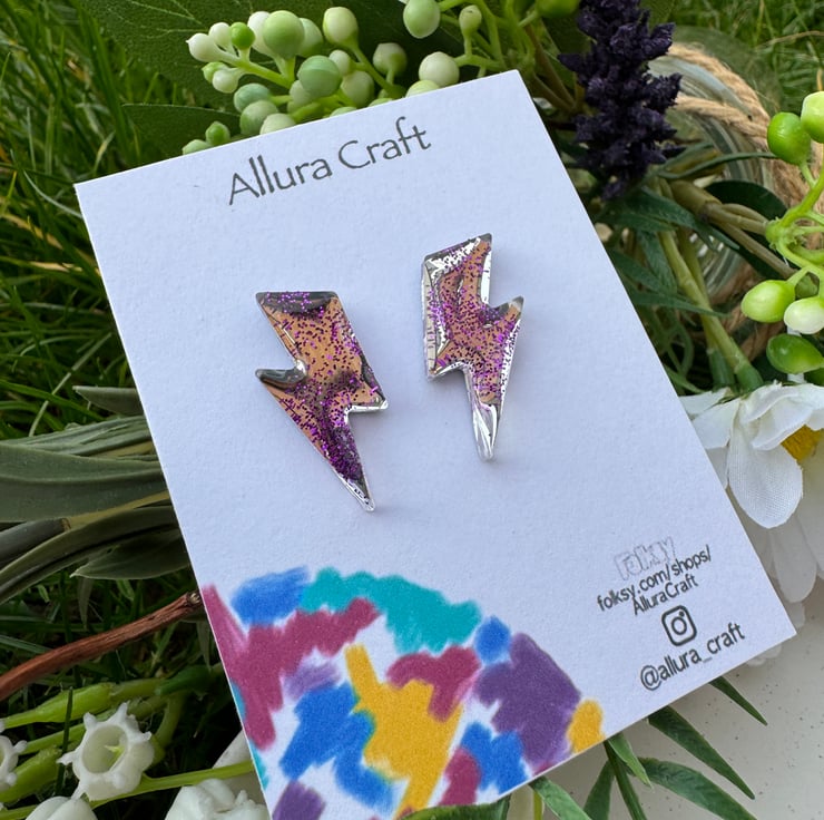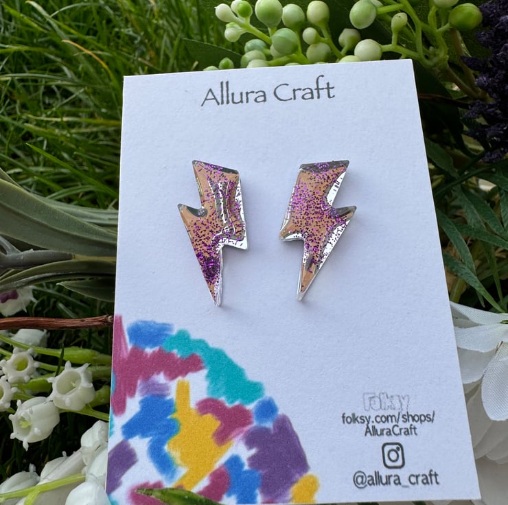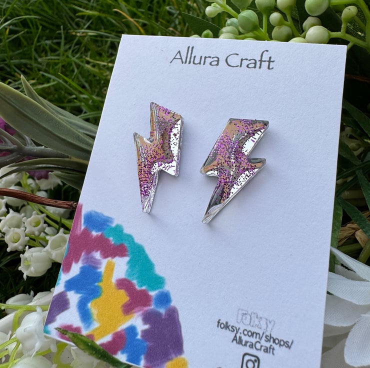 Lightning bolt in a mirrored shape and using silver mirror Acrylic with a sprinkle of purple glitter encased with a top finish of UV Resin