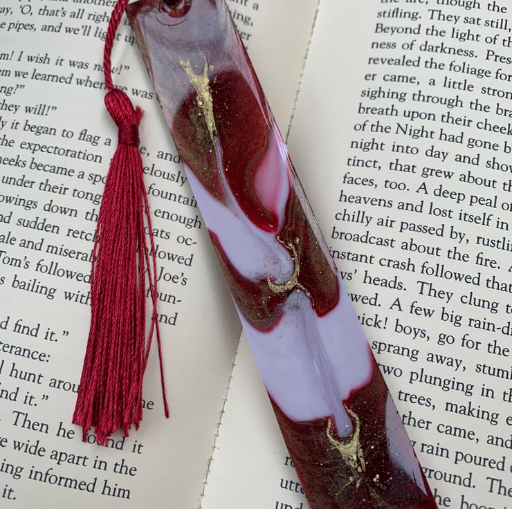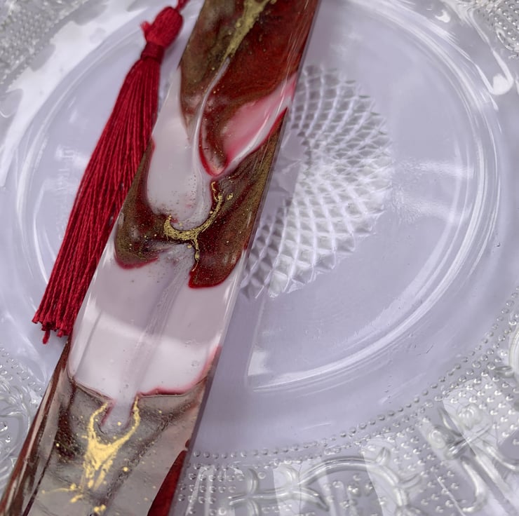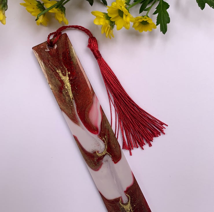 Pretty bookmark for book lovers. I use few different colors. I add little bit purple pigment to white resin, than gold and red. I poured out all 3 colors at the same time and created a beautiful pattern. I add red silky tassel.
