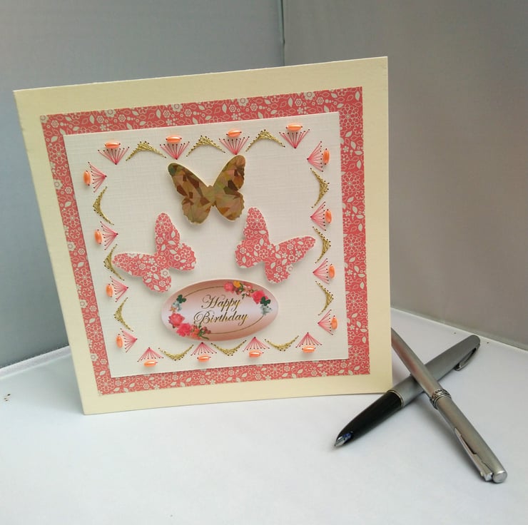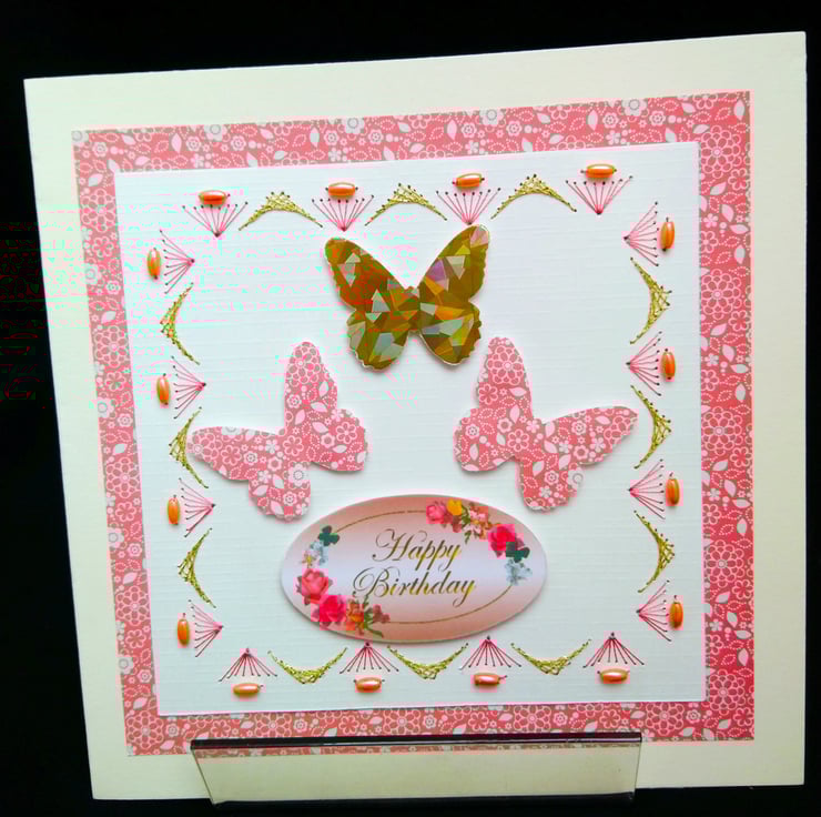 Birthday Card Embroidered with Beads. Paper Butterflies have been added giving a 3D effect. The center butterfly is made from a metallic gold card giving it a nice shimmer. A Birthday embellishment added to the front. The inside has a matching paper with stamped out butterfly shapes. There is plenty of room to write your own words.
