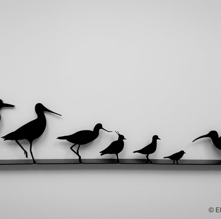 From left to right the wading birds are Stone Curlew, Godwit, Avocet, Lapwing, Golden Plover, Ringed Plover, Whimbrel.