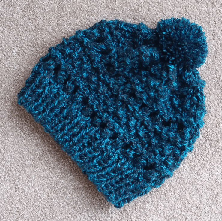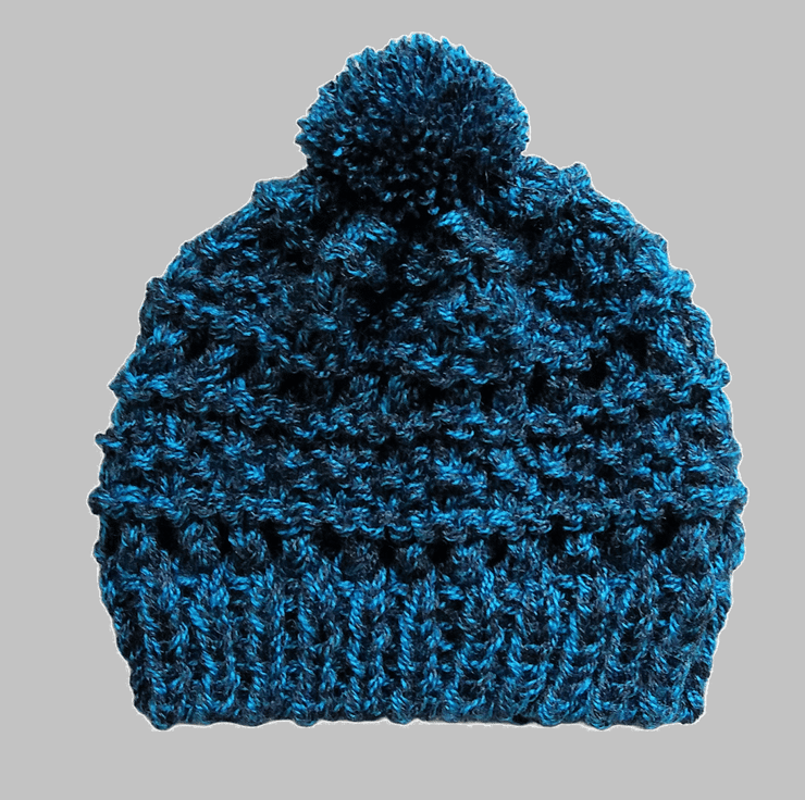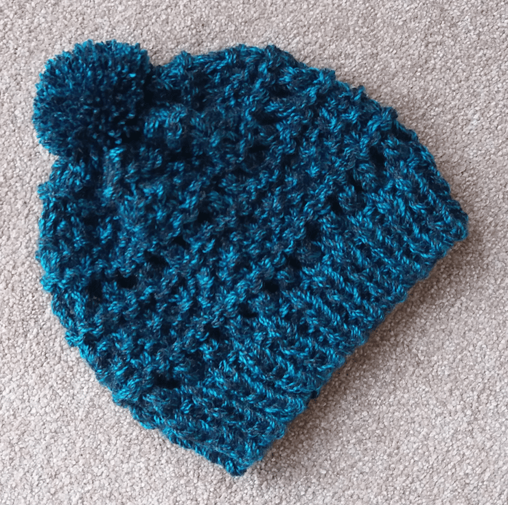 This hand knit PATTERN is for a winter beanie hat. To fit: child (adult): circumference: 48 (52) cm, 19 (20.5) inches. The hat is knitted using double knitting yarn (used treble) using 10 and 12 mm knitting needles and is knit flat and seamed.