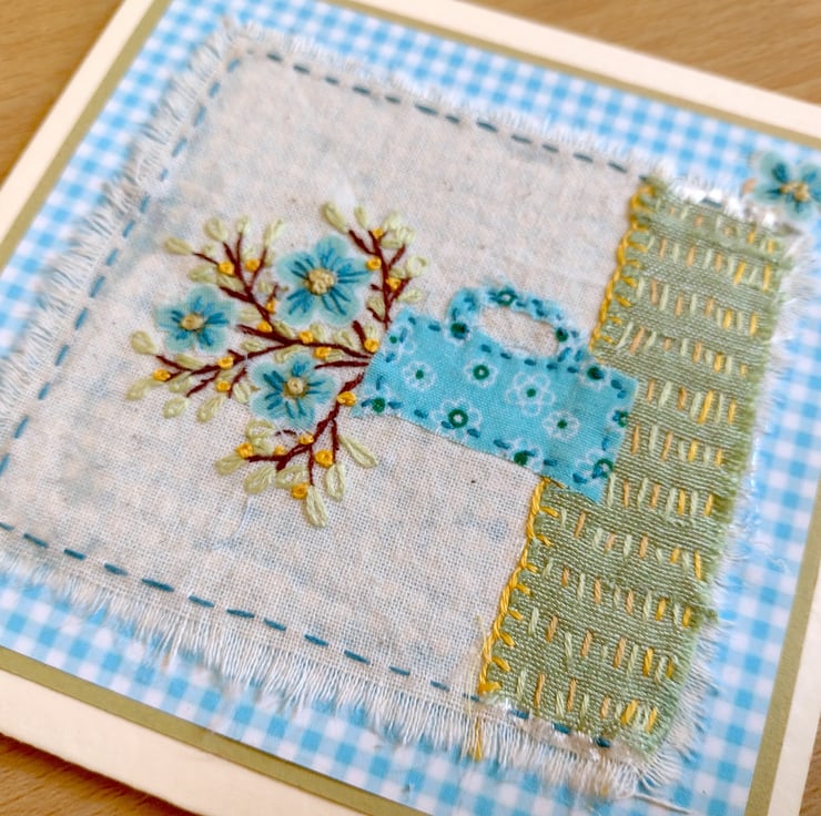 Stitched fabric collage is mounted onto blue and white gingham paper, green card stock and ivory textured folded card.