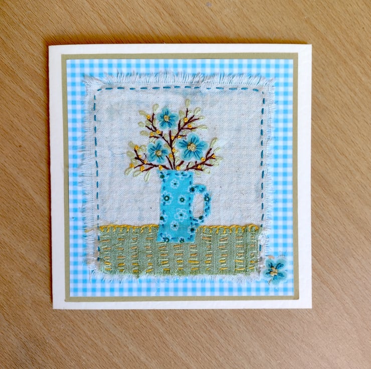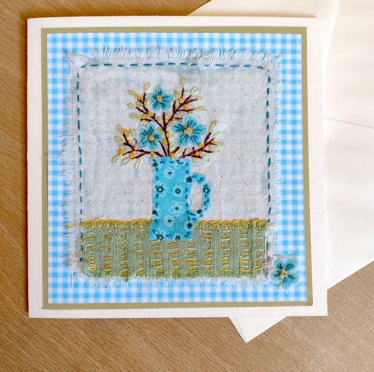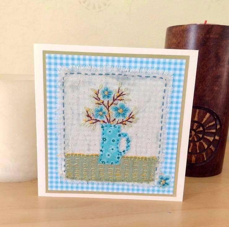 Hand stitched "jug of flowers" blank card for any occasion, created from small pieces of fabric in blue, green and yellow.