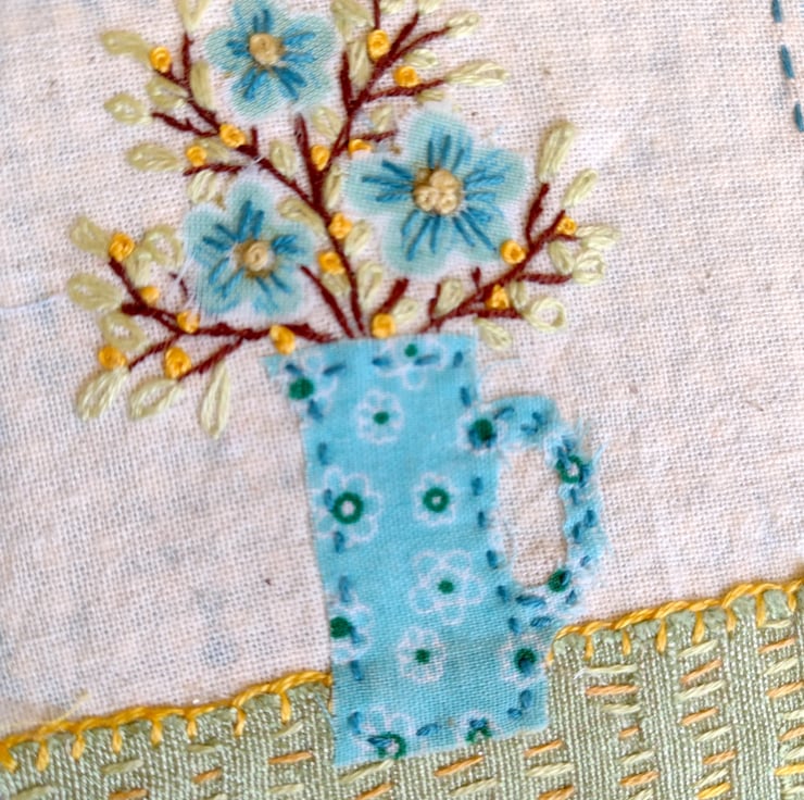 Green fabric has all over running stitched detail, embellished with a small fabric jug, small fabric flowers with embroidery, along with embroidered branches, leaves and french knot buds.