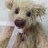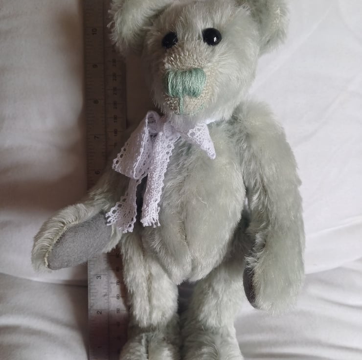 Mojito is a 10"bear made from my own pattern in a mint green 10mm Schulte Mohair with grey felt paw pads. She is 5 way cotter pin jointed, has black English glass eyes and is stuffed with heavy fibre fill and plastic pellets. Mojito has mint green embroidery thread details and wears a lace ribbon bow.