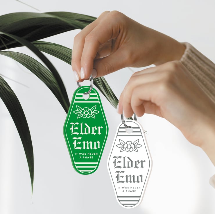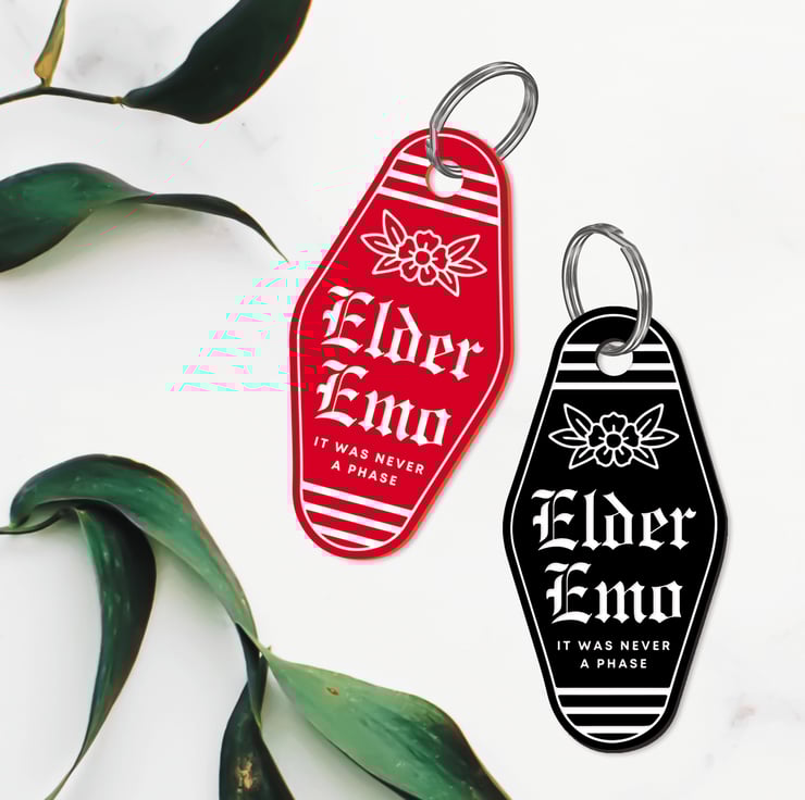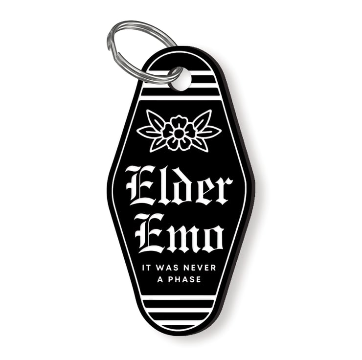 Celebrate your emo spirit with our 'Elder Emo' Motel-Style Acrylic Keyring. This quirky keychain is the perfect accessory for those who proudly embrace their emo roots and love a good laugh.