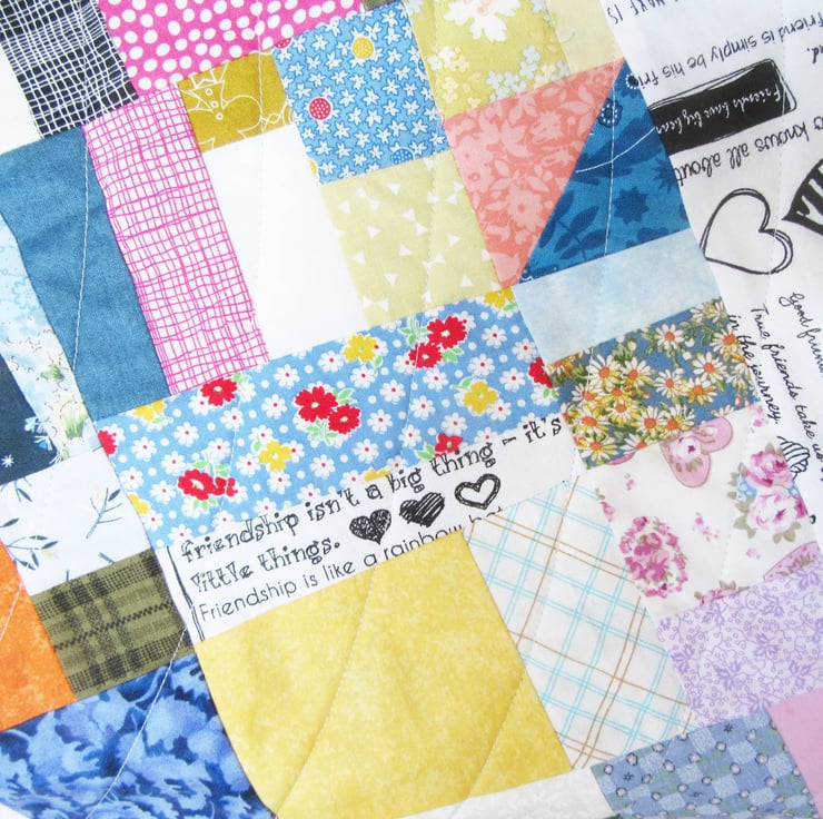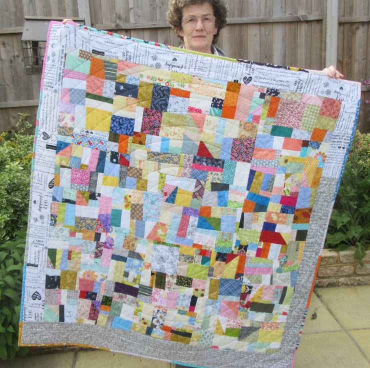 An easy-care cotton quilt ideal for a child from birth to 12 years. Can be used indoors or out: as a snuggle blanket, bedspread, picnic rug or for den building. There are lots of images peeping out from the many novelty fabrics used to create this patchwork blanket - ideal for playing I-Spy or a matching game.