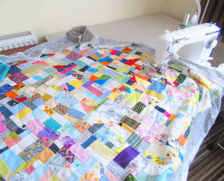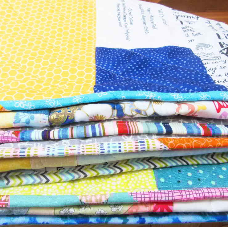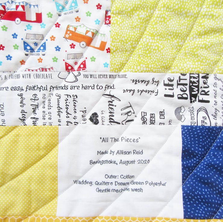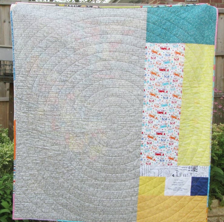 The quilt measures 48" x 57.5" (122cm x 146cm). It is soft, warm and breathable: made from 100% cotton fabrics with an inner wadding of 80% cotton & 20% polyester. The layers of the quilt are stitched together using a spiral design to add extra texture and stability.