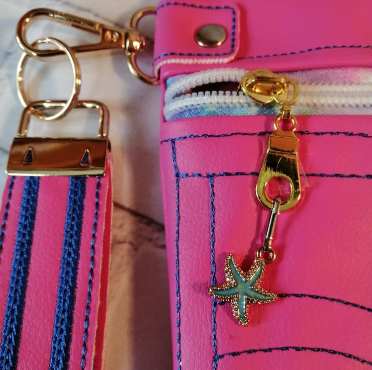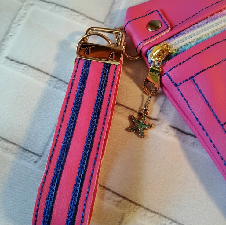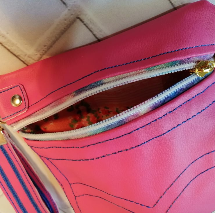 I have made two of these bags, the other one is also listed for sale in my shop. They are both made in vinyl and are fully lined with a zip closure and cute charm. They both come with the detachable wrist strap.