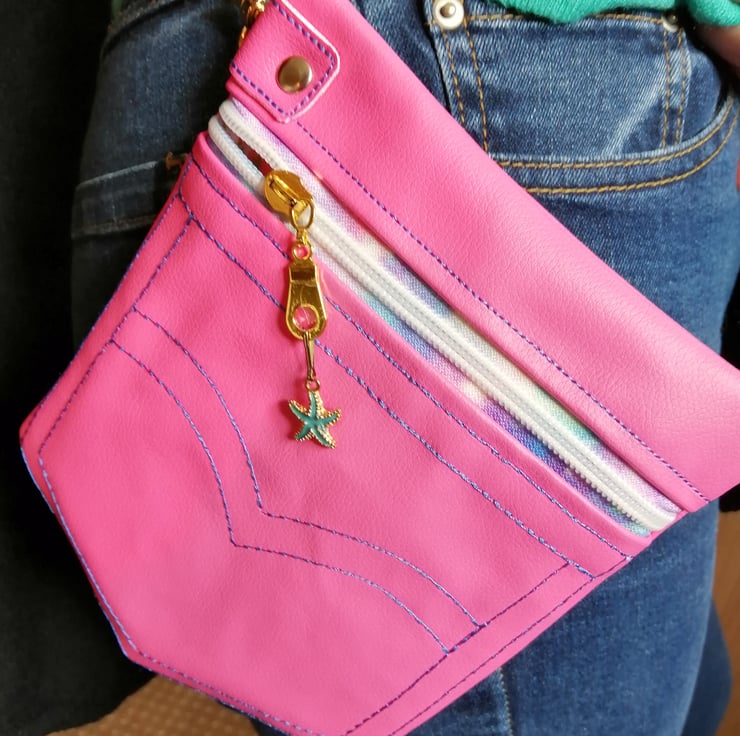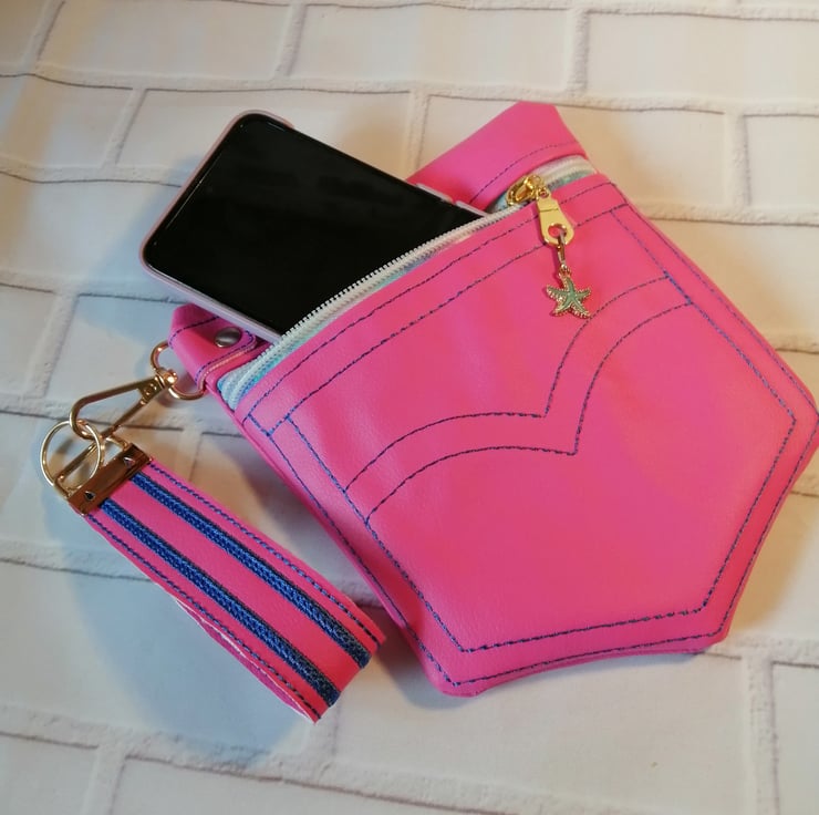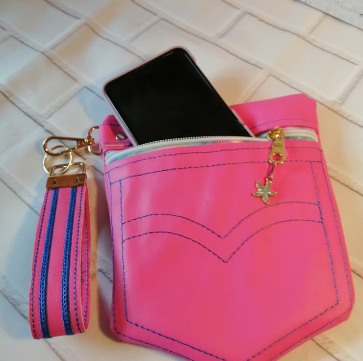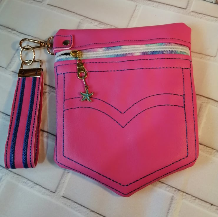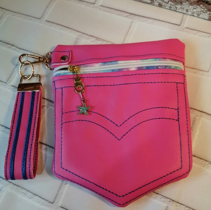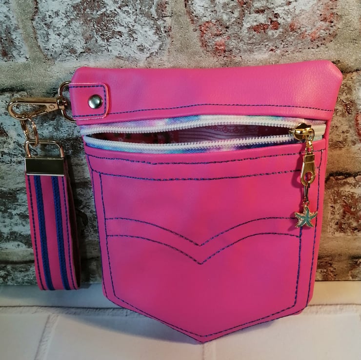This fabulous vinyl bag is styled in a jeans pocket theme. It's so versatile and has so many uses. Use it as a make up bag, toiletries bag, doggy walk bag, it can be hooked on your jeans loop to carry treats or a mobile phone., in fact whatever you choose. It comes with a wristlet so you have the option to carry it around your wrist.