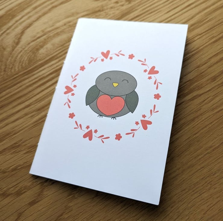 The cover of this handmade notebook features a Robin surrounded by hearts and flowers. It would be a perfect gift for someone who loves animals, or to someone you love!