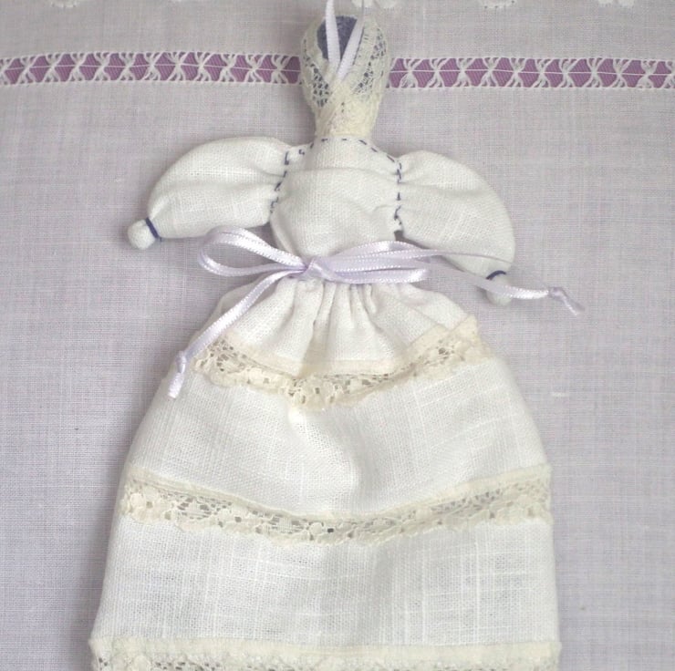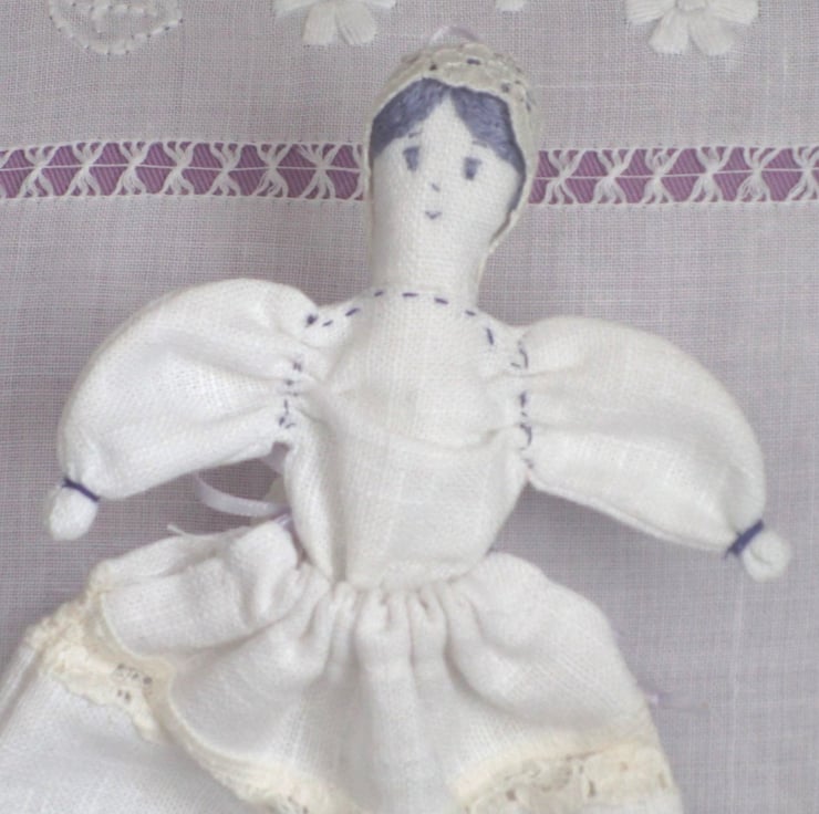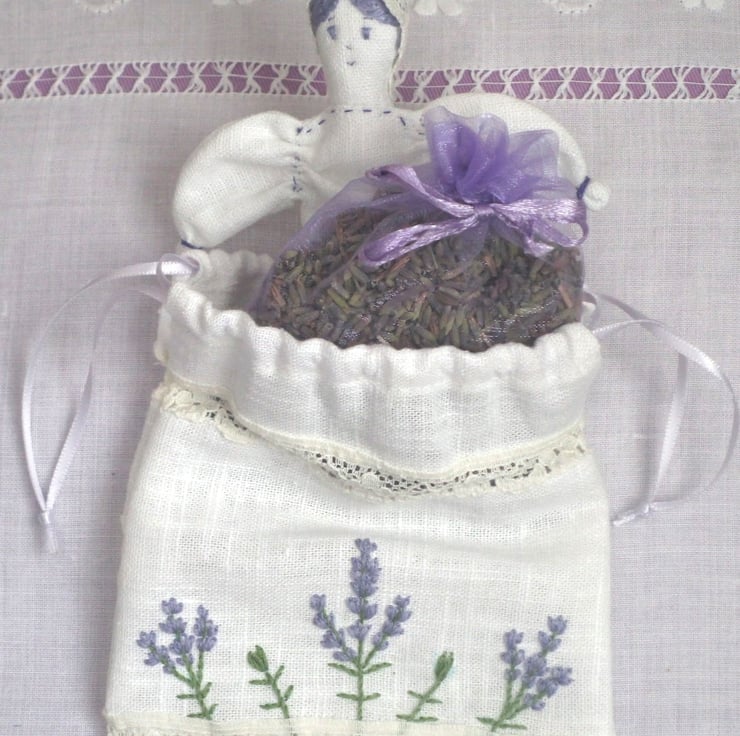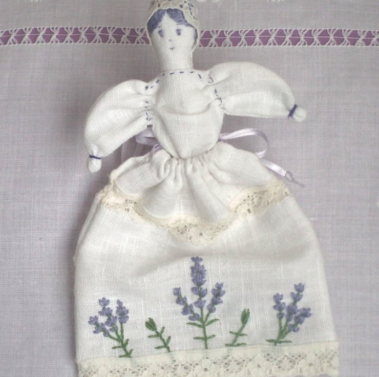 The doll is wearing a lovely puffed sleeve dress, made of linen, on which I embroidered lavender and inserted polyester lace, front and back. As well as looking decorative, the lace parts also let the lavender scent through well.