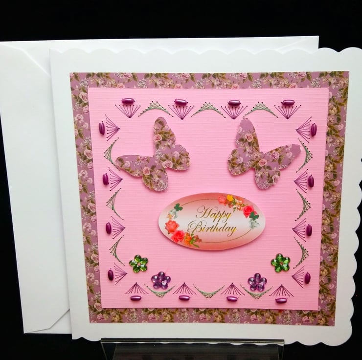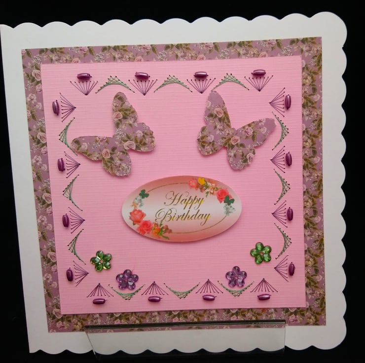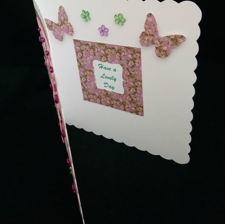 Birthday Card Embroidered with Beads. Paper Butterflies have been added giving a 3D effect. Beads in purple, embroidery thread is purple and green. Embellished to the front are flower type beads/sequins in green and purple. A Birthday embellishment added to the front. The inside has a matching paper butterflies and a surround paper quoting the sentiment' Have a lovely day' in green and again green and purple flower bead/sequins. There is plenty of room to write your own words.