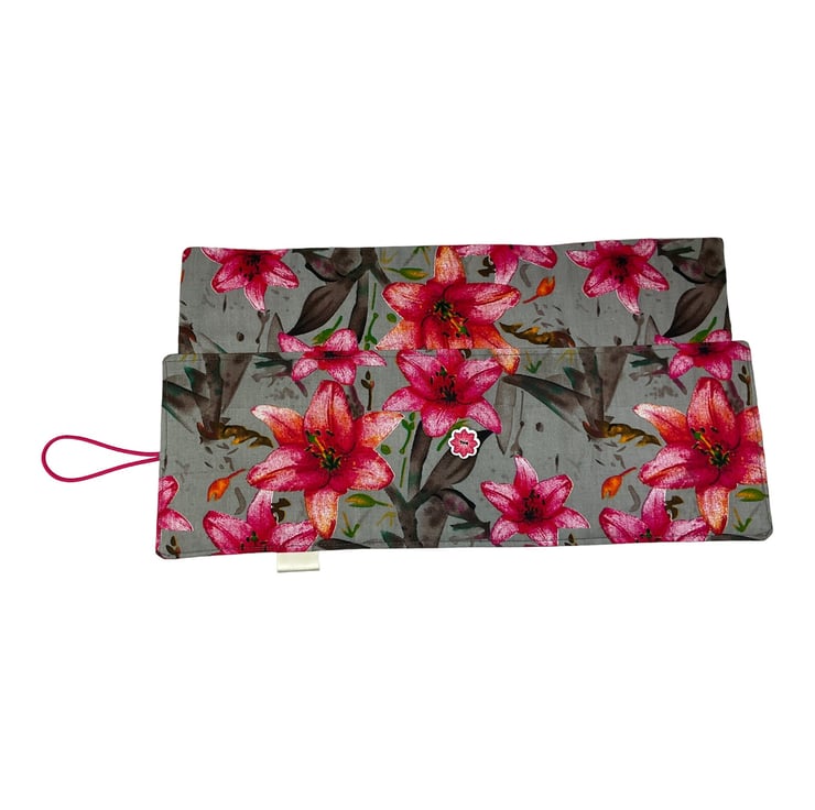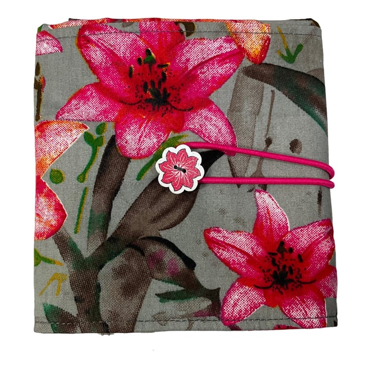 The case neatly folds into thirds and is fastened with a pink elastic loop and a wooden button. Pattern placement and button may vary.