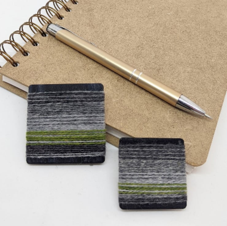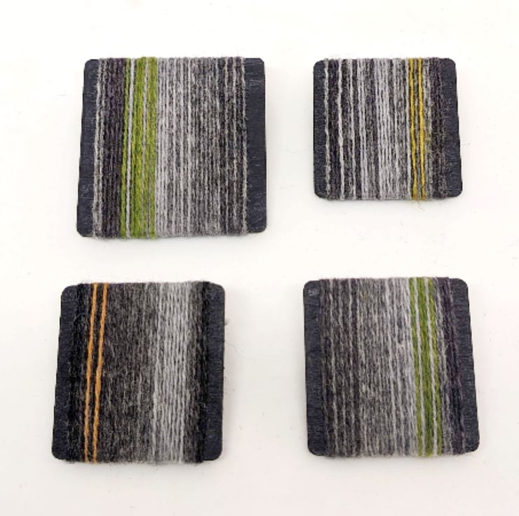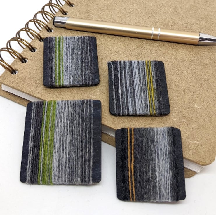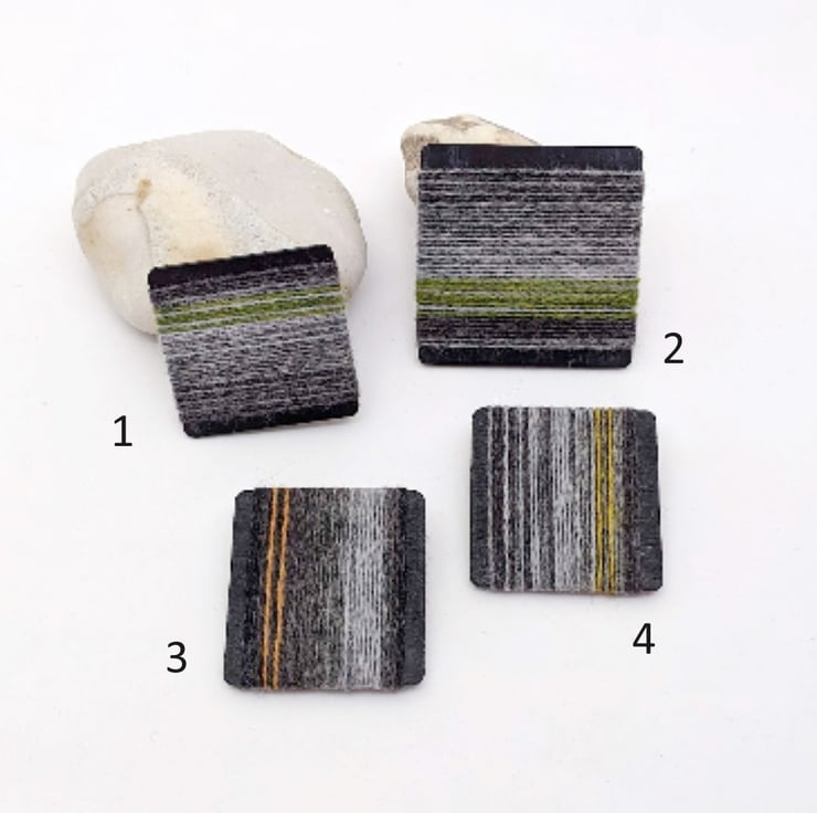 Soft merino lambswool strands wrap around a light wooden base to make these quirky brooches. Shades of grey contrast with a zingy stripe of colour - green, yellow, pale orange. I can't decide whether they look best worn horizontally like a mini landscape, or vertically stripey, so I have placed the brooch pin securely in the centre so you can choose!