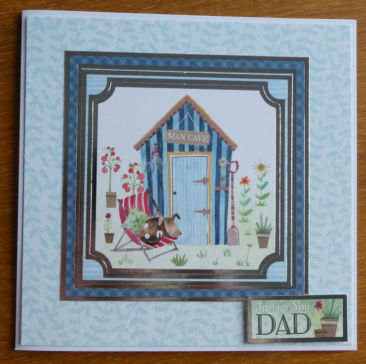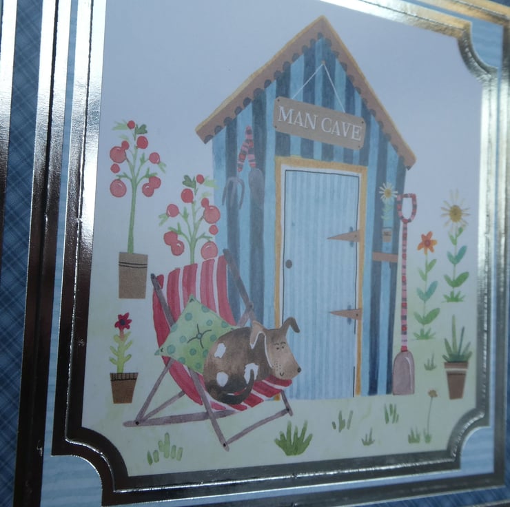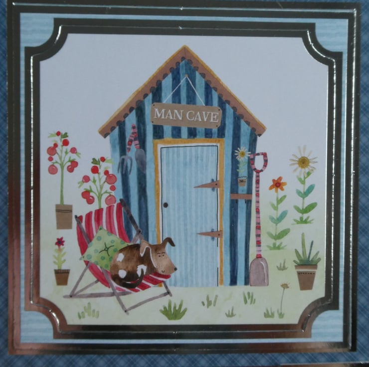 The card has a printed image of a brown and white dog curled up in a stripey deckchair outside a blue painted shed with a sign saying Man Cave. All surrounded by plants in pots.