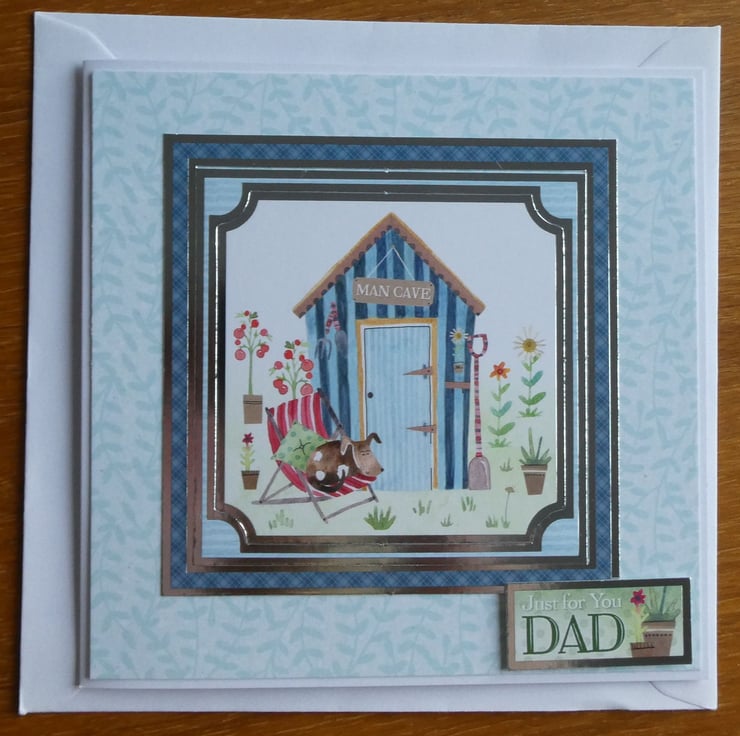 With an image of a dog curled up in a deckchair outside a shed and the message Just for You Dad this card would be ideal to send as a Birthday, Father's Day or Retirement card.