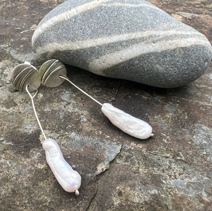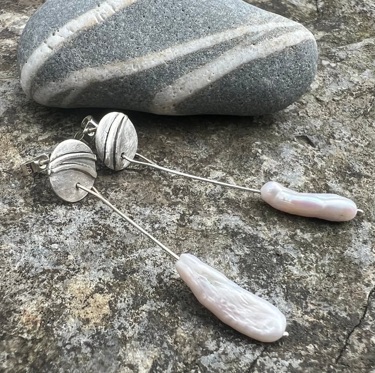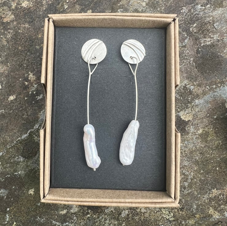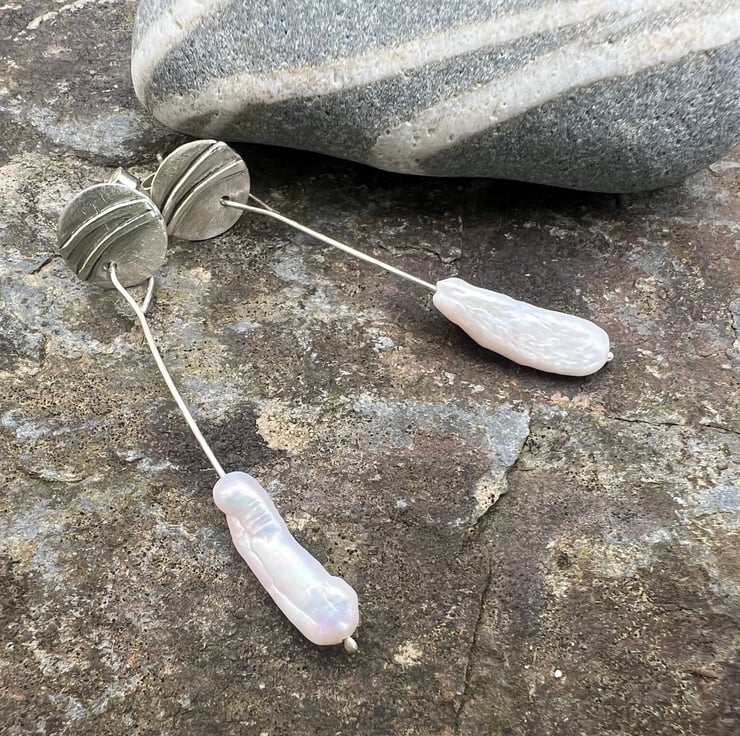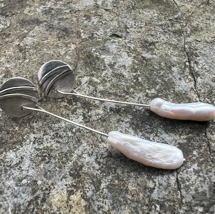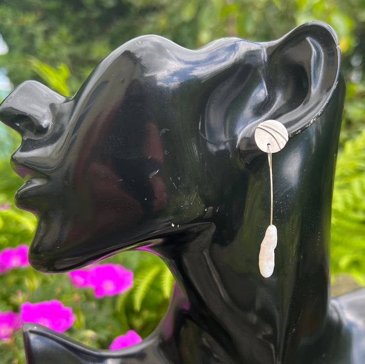 Silver circles with curved silver detail, inspired by the coast, with a biwa freshwater pearl drop. The circle sits neatly on the ear with a sterling silver earpost and scroll back fastening. The pearl dangles freely from a piece of silver wire , which has a soldered loop.