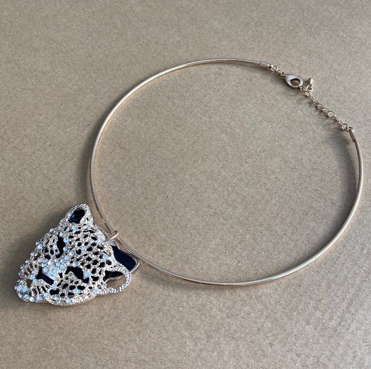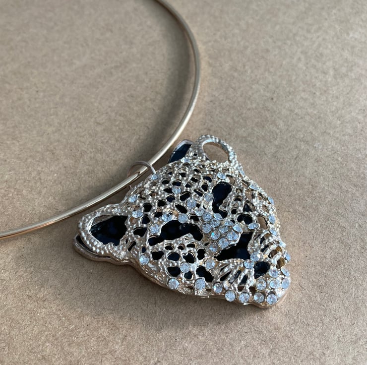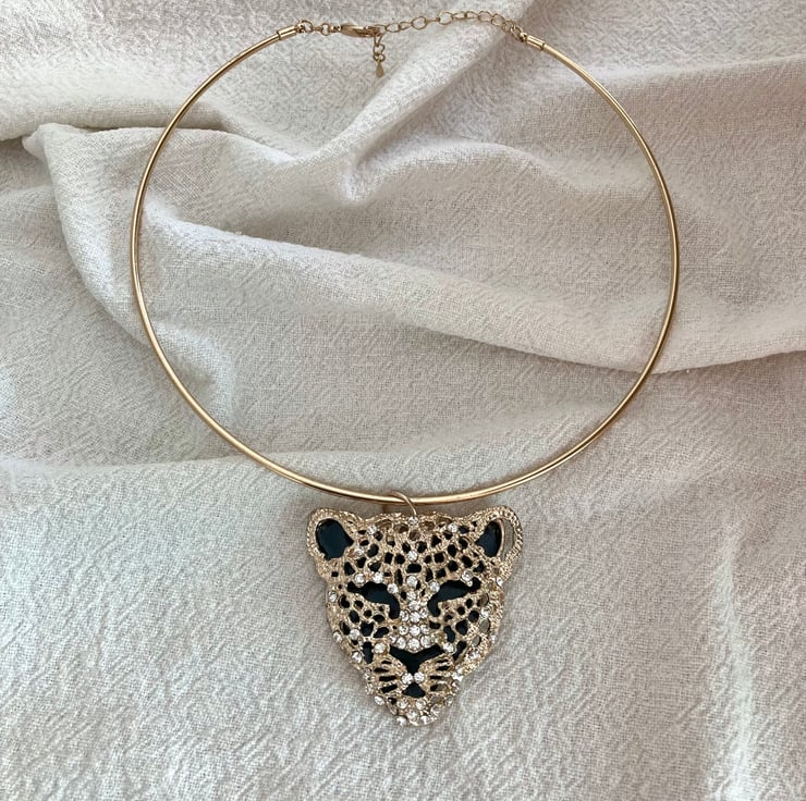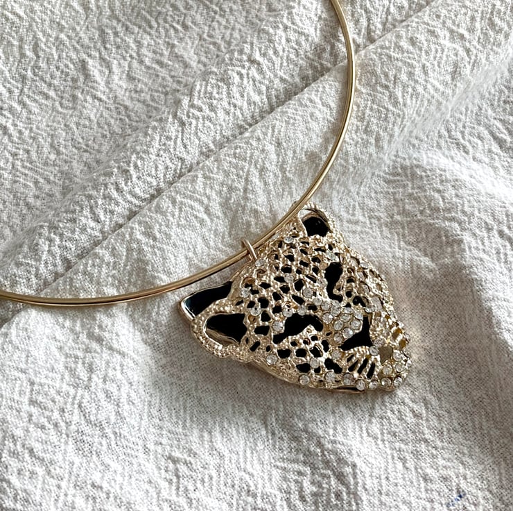 Vintage Handmade Up-cycled Sparkly Rhinestone Pendant Leopard Head Gold Tone Wire choker - Necklace for Her - Pre-owned - Gift for her - Gift for Birthday - Gift for women - Unisex Jewellery