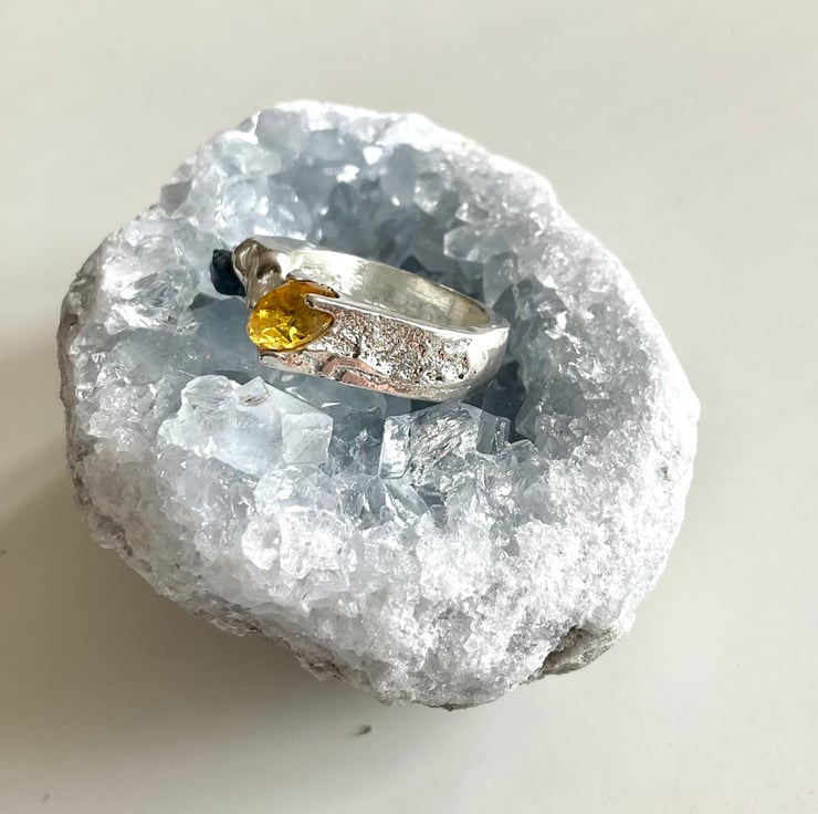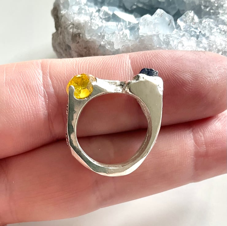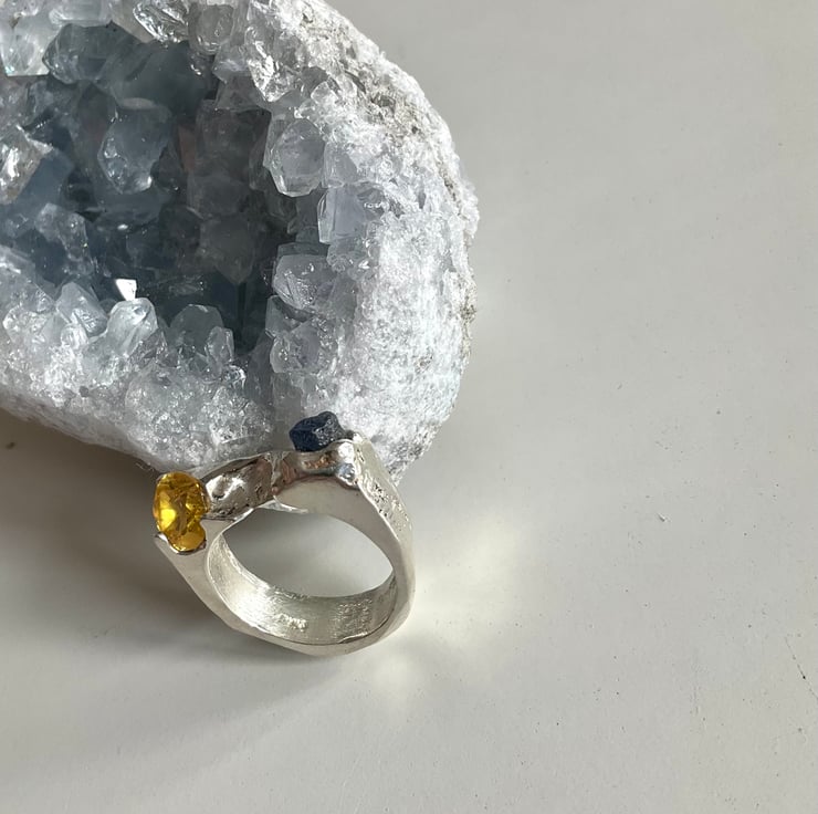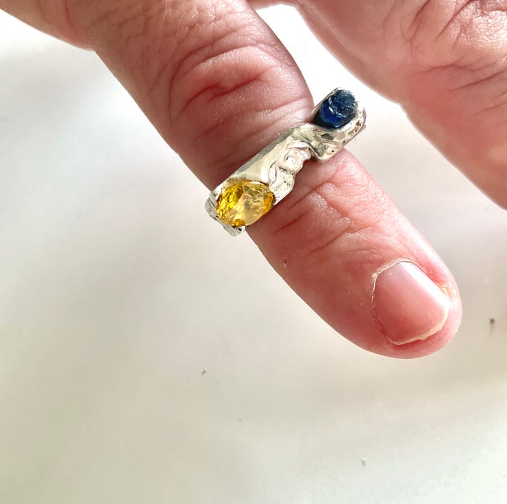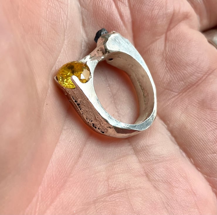 This is an organic textured Sterling Silver signet ring with a dark blue raw uncut sapphire and a yellow cubic Zirconia stones cast into it. The ring has been created through ‘sand casting’ technique (see below).